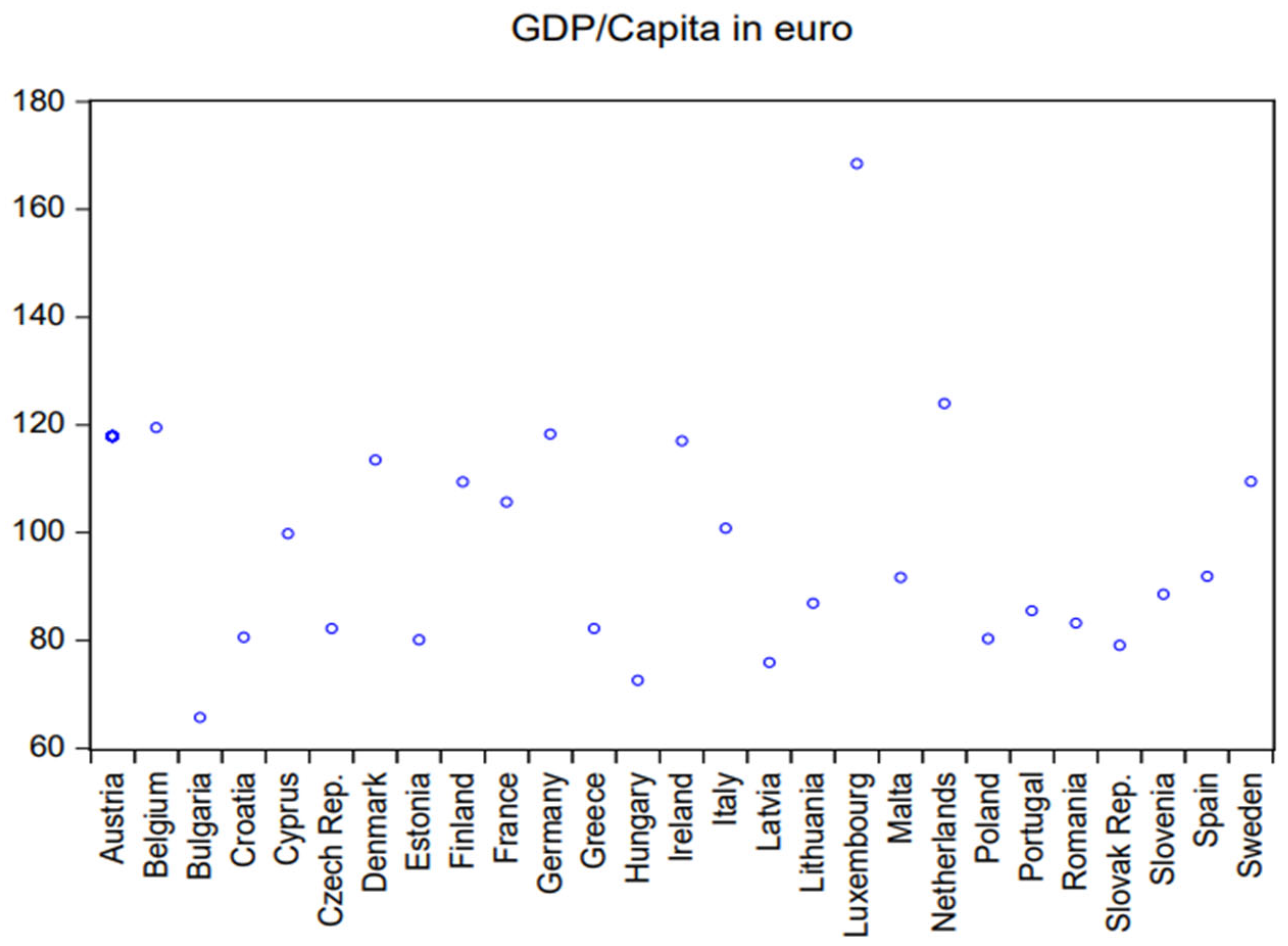 Figure 7, the scatter plot depicted above reveals the levels of GDP/Capita. Luxembourg stands out as a clear outlier with the highest figure, reflecting its strong financial sector and small population. Other high-income countries, such as Ireland, the Netherlands, Austria, and Sweden, also show significantly higher GDP per capita. In contrast, Southern and Eastern European countries, including Bulgaria, Romania, Greece, and Latvia, record much lower GDP per capita (ranging from approximately 70 to 85). Most countries cluster in a moderate-income range (between 80 and 120). This chart highlights a significant wealth disparity across the EU, with richer Western members contrasting sharply with lower-income Eastern and Southern members. This economic gap is an essential control variable in our regression analysis, as it can influence countries’ capacity to invest in renewables and implement effective environmental policies.