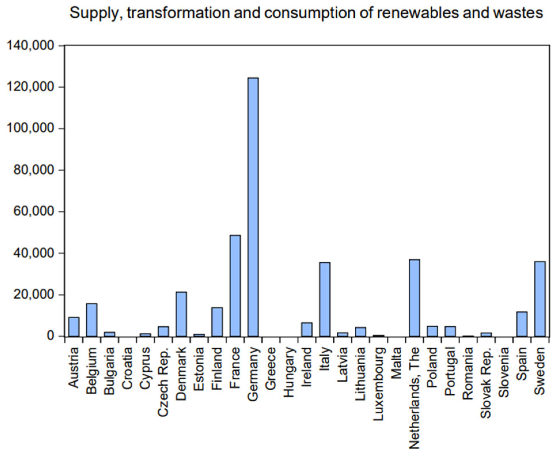Figure 8 illustrates the supply, transformation, and consumption of renewable energy and waste (measured as a percentage of gross final energy consumption) at the EU level in 2023. This is a relevant indicator for our analysis, as it illustrates the cycle of matter from waste to renewal. Germany dominates by far, with the highest renewable and waste energy use, reflecting its large economy and Energiewende policies. France, Sweden, Italy, and Spain follow with substantial renewable use. Many smaller or less industrialised economies, such as Malta, Cyprus or Luxembourg, show very low values. Eastern European countries, such as Poland, Romania, and Bulgaria, remain at the lower end, indicating slower adoption of renewable energy.