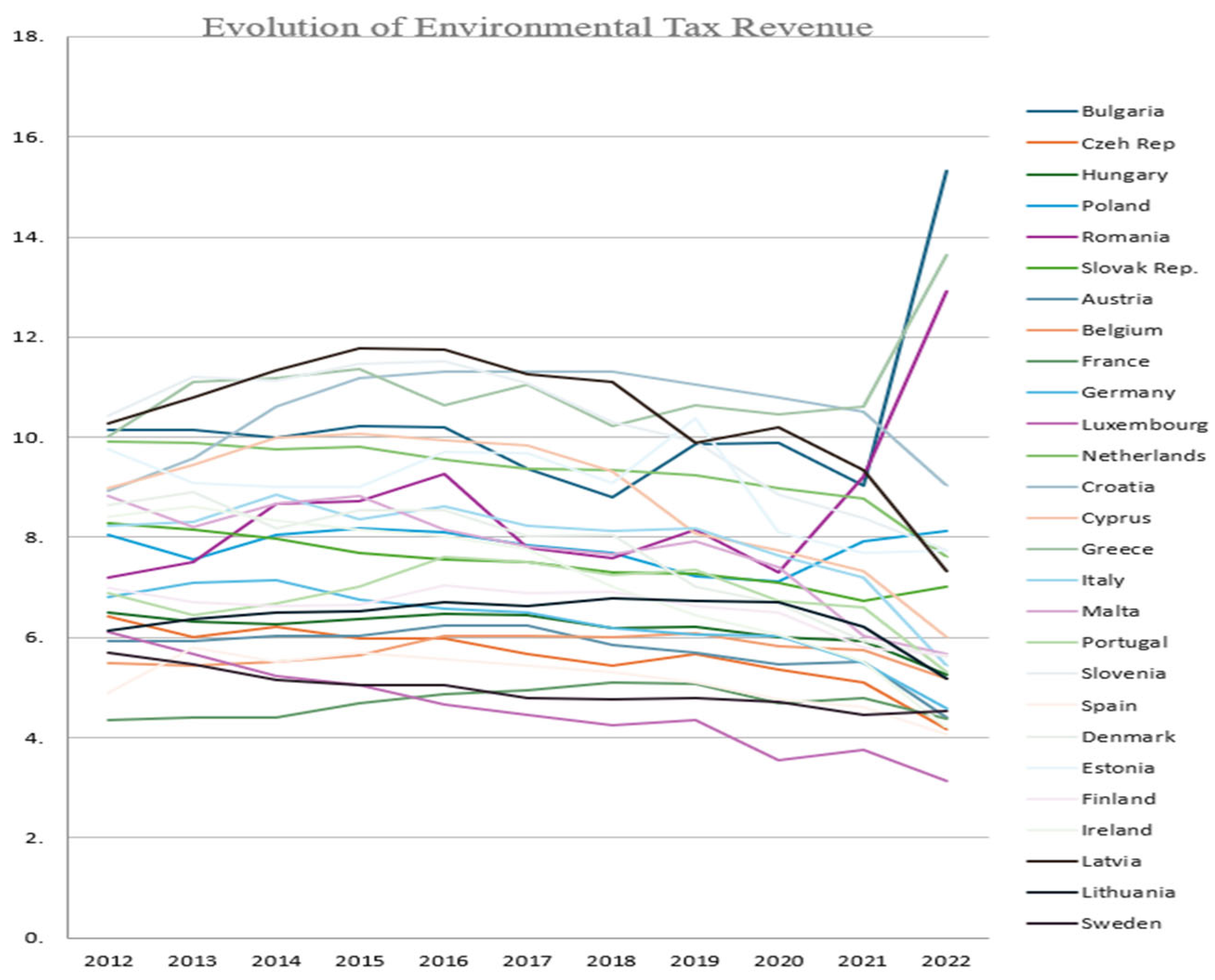 Figure 9, which shows the indicator’s evolution over time across all states. Environmental tax revenue serves as a vital instrument within the European Union, aiming to deter environmental degradation and contribute to the sustainable development agenda. Its modifications over time reflect evolving environmental goals and increasing commitment to ecological responsibility. Since its implementation, this revenue has been modified to align with changing environmental goals and an increasing commitment to ecological responsibility. Here, we can gain a better understanding of each country’s evolution in terms of environmental tax revenue. Notably, the most developed countries appear to have the highest environmental tax revenues, as levels of CO
