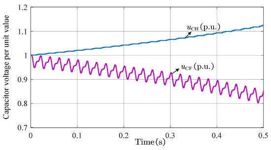 Stable balance state of capacitor voltages after injecting the second harmonic () when the DC voltage drops to 0.5 p.u.