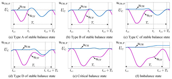As observed from Equation (8), the calculation involves complex integral operations, which increase the difficulty of implementing the control strategy. Therefore, it is necessary to optimize the control approach by leveraging the system’s characteristics. Under overmodulation conditions, depending on the modulation index, the capacitor voltage behavior can be categorized into three states, as shown in Figure 4: stable balance state, critical balance state, and imbalance state [20].
