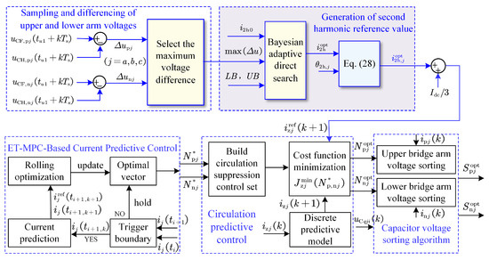 After obtaining the second harmonic reference, it is superimposed with the DC component to form the circulating current reference and integrated into the control system. As illustrated in Figure 6, the overall control architecture integrates this reference into the system. For AC output current tracking, an event-triggered MPC is employed, where system states are sampled and optimized only when the error exceeds the threshold. An initial set of submodule numbers and minimizing is selected. These are then perturbed by ±1 and 0 to form a candidate set, from which the optimal values and minimizing are determined via rolling optimization, enabling circulating current regulation. Finally, capacitor voltage balancing is achieved using a sorting algorithm, and the optimal control vector is output.