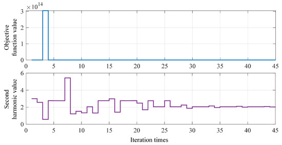 To validate the effectiveness of the Bayesian Adaptive Direct Search (BADS) control algorithm, this study takes the process of generating the optimal second harmonic component at a modulation index of as an example. The performance of the algorithm in terms of dynamic adjustment and global convergence is systematically analyzed. Figure 7 illustrates the evolution of the objective function over 45 iterations with respect to the second harmonic current .