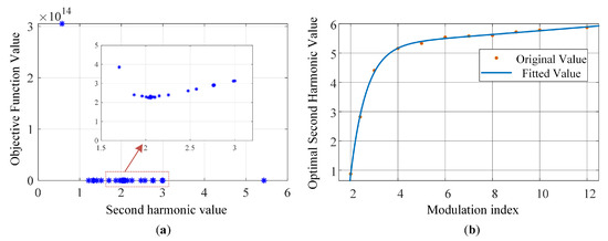 Iteration process and function fitting. (a) Variation in objective function value with second harmonic component. (b) Fitting curve of the optimal second harmonic function.
