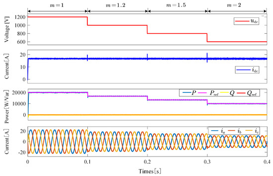 Figure 9 presents the system dynamic response waveforms under four different DC voltage levels (1200 V, 1000 V, 800 V, and 600 V), including DC current, transmitted power, and the time-domain characteristics of the AC output current. The results show that as the DC voltage decreases from 1200 V to 600 V (corresponding to a modulation index increase from to ), the transmitted power and AC output current decrease linearly, while the DC current remains constant, consistent with the initial parameter settings.