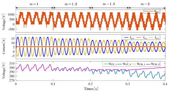 Figure 10 illustrates the dynamic response waveforms of arm voltage and current and submodule capacitor voltages under step-down operating conditions. The influence of the modulation index on capacitor voltage balancing is summarized as follows: