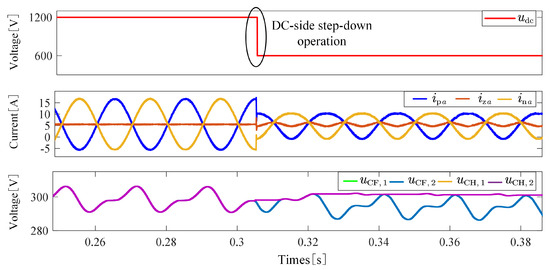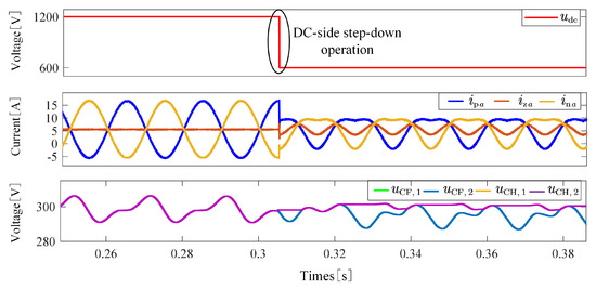 Dynamic response waveforms of arm voltage, current, and submodule capacitor voltages during DC-side step-down operation.