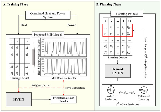 We start the training phase by using the proposed MIP model to generate a set of scenarios which are then used to create the training dataset. The dataset for training HYTIN includes the demand () and production costs () at time t, as well as the inventory () and previous heat production volume () at time t − 1. Given an initial inventory () and initial production level (), the MIP begins its decision-making process. Using the CHP mathematical constraints from Section 3, the MIP generates decision results for production volume (). Similarly, HYTIN uses the same demand, production costs, inventory, and production volume information to predict one of the available production levels (), as presented in Section 3. The MIP decision results are mapped to one of s, which become target values for training. The error is then calculated between the HYTIN-predicted production level and this target value. After the training phase, HYTIN saves the best model states based on the training dataset.