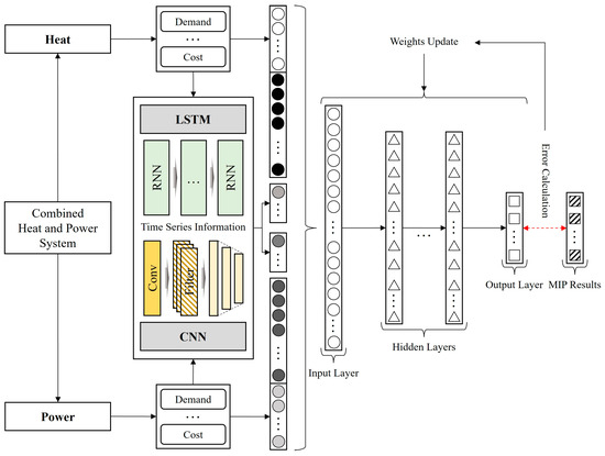 Therefore, we used LSTM and CNN to encode both long- and short-term time series patterns for heat and power. LSTM is particularly effective at remembering long-term time series patterns and is skilled at identifying repetitive patterns with relatively low fluctuation. On the other hand, CNNs have the unique ability to extract spatial features from time series data, even with large fluctuations. This allows them to identify both small and large patterns in the short term. By adding the results of this pattern analysis for heat and power input data to the input layer, the neural network can better learn the time series information. Subsequently, the model selects one of the pre-fixed production levels through its hidden and output layers. The resulting output is then compared to the existing MIP decision results to perform a weight update.