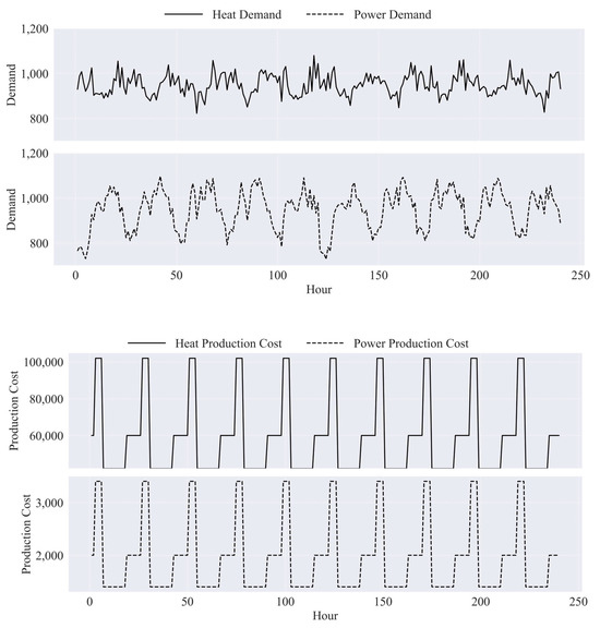Figure 4 presents 240 h samples from recorded demand and production cost series in South Korea. The three-year record indicates that each heat and power demand has similar averages while power varies more. Production costs follow Korean day–night pricing rules, although the magnitudes differ; both series follow the same day–night structure, yielding aligned patterns [10]. Most patterns are opposite across the two products, yet overlap occurs at several points, which makes complicated switching decisions. For example, when production cost is low and demand is high, the production level must be high for the operation cost to be measured as low. Consequently, the parts considered important by the data are decided through the decision process.