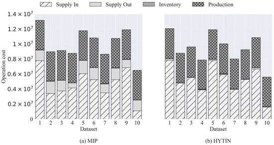 Figure 6 compares the composition of operation cost by dataset for (a) MIP and (b) HYTIN where HYTIN lowers total operation cost mainly by reducing supply-out costs. HYTIN shows more supply-in in several datasets, yet total external transactions are lower because supply-out is smaller, especially in datasets four and ten. As Figure 5 shows, production volumes remain close to the MIP baseline, so production costs are similar. The operation cost advantage, therefore, comes mainly from fewer sales to external networks rather than from changes in production, which is consistent with the aim of limiting external transactions.