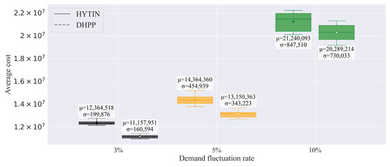 Boxplots for DHPP and HYTIN average operation cost under 3%, 5%, and 10% demand differences with ten-run mean and standard deviation.