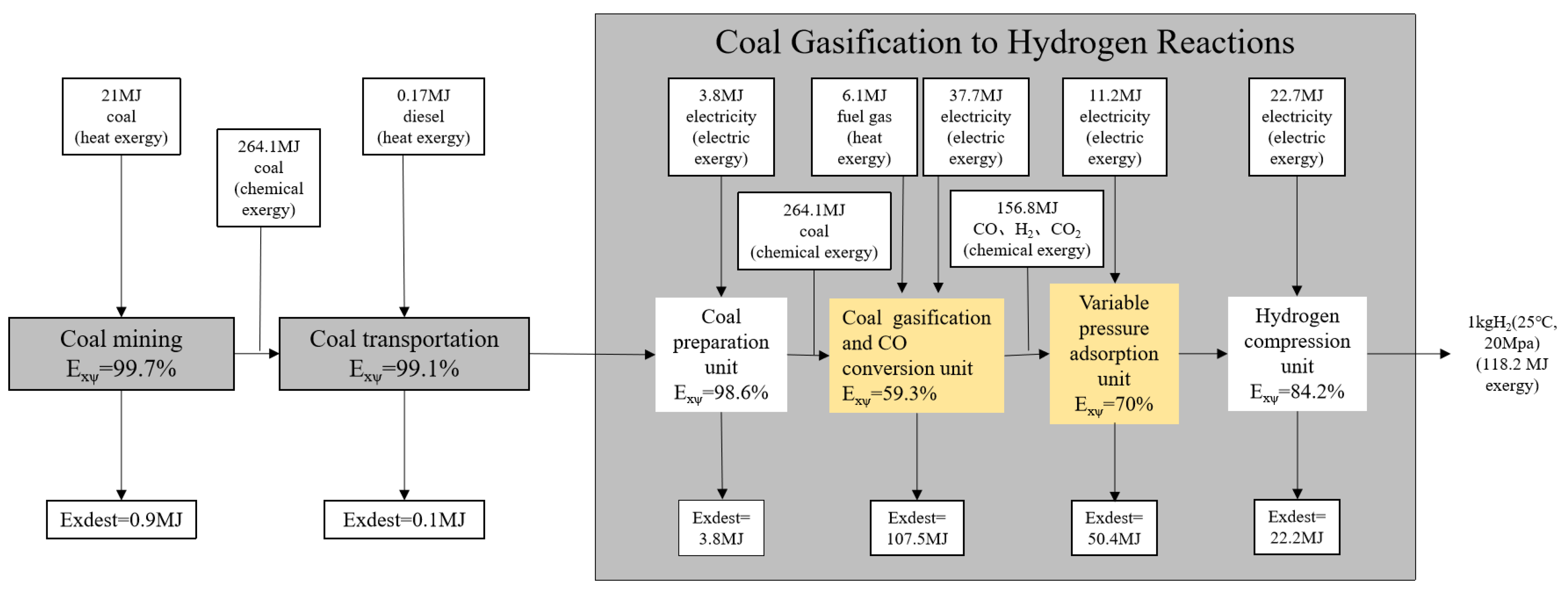From an LCA perspective, the exergy flow and consumption processes across each stage of China’s coal gasification hydrogen production are illustrated in