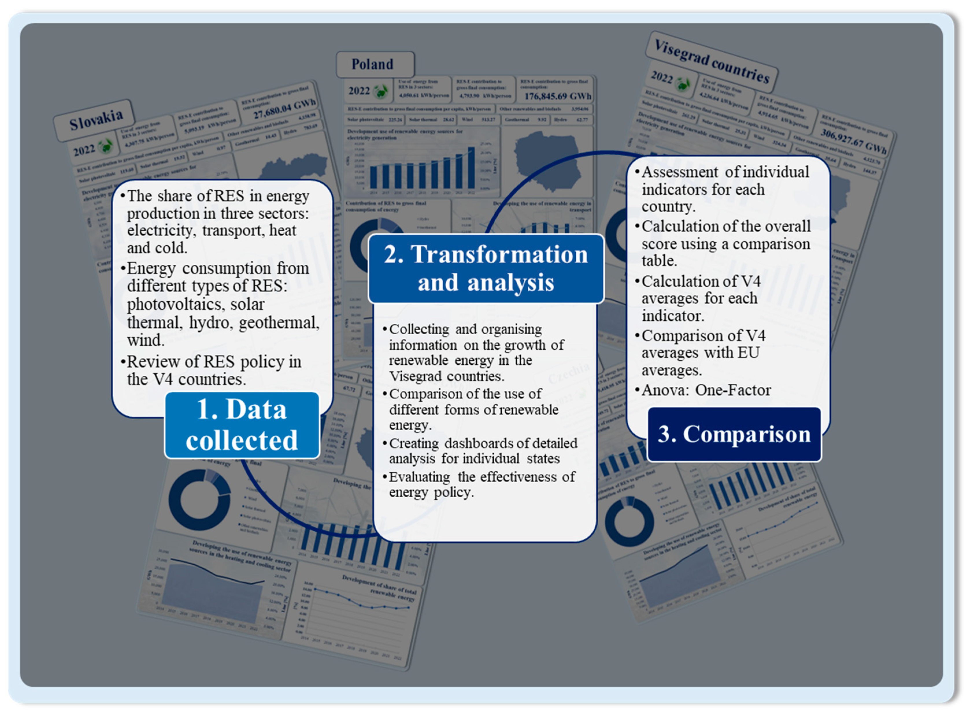 Figure 1). The aim was to compare the structures and efficiencies of RES use in these countries and identify areas for improvement. Emphasis was placed on analysing the share of RES in the transport, electricity generation, and heating and cooling sectors. The period 2014–2022 was chosen for two main reasons: (1) limited data availability for some indicators for 2023 at the time of writing the study, and (2) the desire to minimise data distortion caused by the extensive changes in the energy mix that occurred as a result of the war in Ukraine. The year 2023 was excluded because data for many relevant indicators were either unavailable or incomplete. The impact of the war in Ukraine on EU energy markets was significant, leading to sharp changes in energy consumption and production that could distort the analysis of long-term trends in RES development. By analysing the period preceding this conflict, we sought to provide a more accurate picture of the underlying trends in RES development across the V4 countries, free from the influence of these extraordinary events. This study also focused on analysing RES support policies and differences across V4 countries to evaluate their impact on RES development and identify the most effective approaches for future RES development in the region. The study also considered bureaucratic, political, and cultural barriers that influence the adoption of RES in the analysed countries.