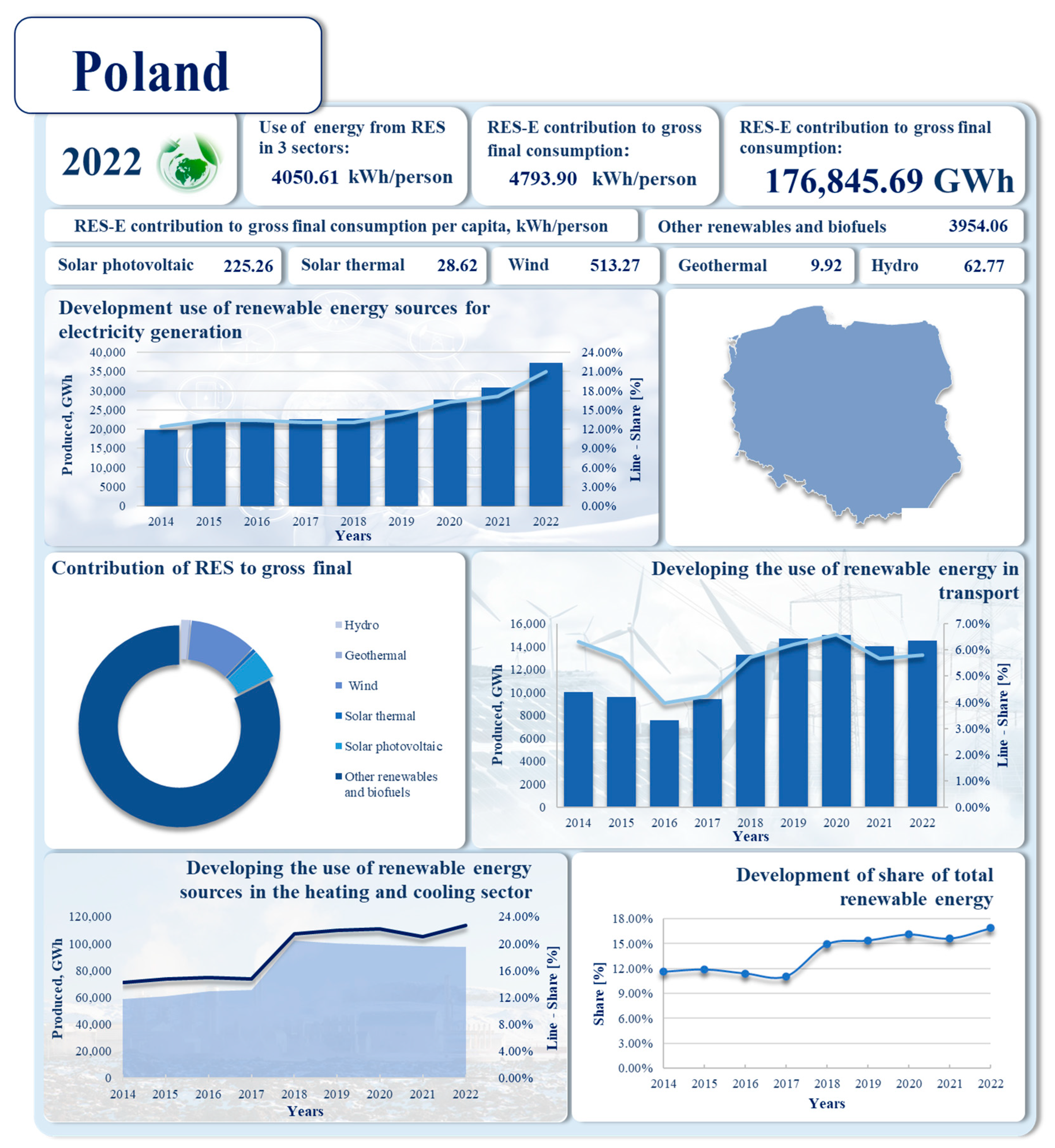 Poland is making efforts to transform its energy sector towards renewable energy sources (RES), but the pace of this transition is relatively slow and it faces significant challenges. While the increase in the share of RES in electricity generation and the growing adoption of heat pumps and solar technologies indicate some progress, the overall picture is more complex and requires critical evaluation. The contribution of energy from RES to gross final energy consumption is indeed diversified, but biofuels play a dominant role, the sustainability of which is debatable. Hydro energy (2315.46 GWh, 62.77 kWh/person), geothermal energy (365.98 GWh, 9.92 kWh/person), wind energy (18,934.52 GWh, 513.27 kWh/person), solar thermal energy (1055.76 GWh, 28.62 kWh/person), and solar photovoltaics (8309.67 GWh, 225.26 kWh/person) contribute to varying degrees. Still, the largest share is in the “other renewable sources and biofuels” category, with a value of 145,864.29 GWh (3954.06 kWh/person). The total contribution of RES reaches 176,845.69 GWh (4793.90 kWh/person). However, it is essential to emphasise that the high share of biofuels may mask the actual progress in the field of RES, as some biofuels do not meet sustainability criteria and their production may hurt the environment (