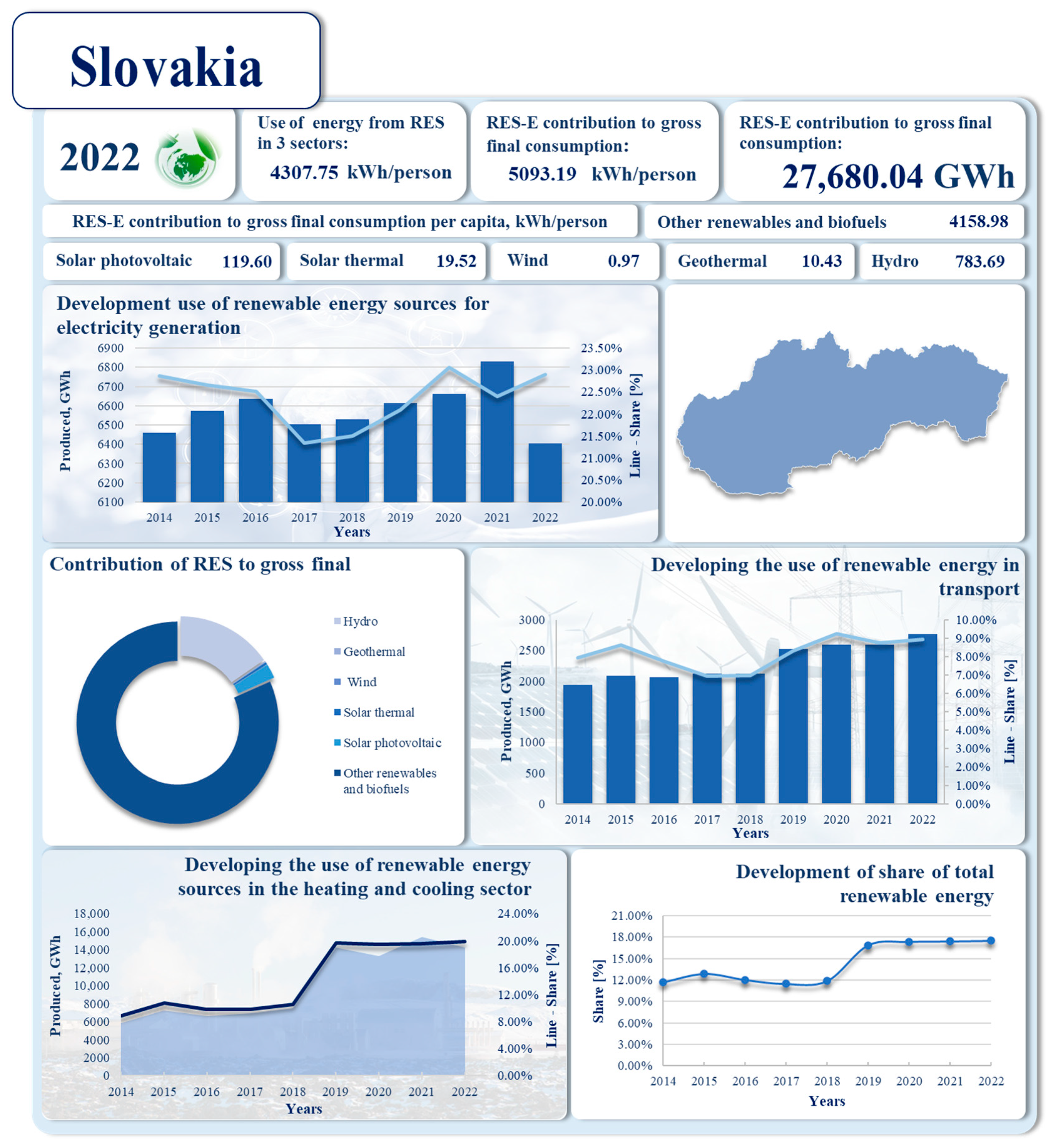 The share of RES in electricity generation reached 22.90% in 2022, compared to 22.87% in 2014, indicating stagnation and raising questions about the effectiveness of the support mechanisms in place. Findings from the Annual Report of the Slovak Photovoltaic Industry Association (SAPI) indicate persistent administrative barriers and insufficient support for the development of small- and medium-sized solar system installations, hindering their wider application in the energy mix. The overall 17.50% share of RES in Slovakia’s energy mix signals some progress, but given the country’s potential and commitments to the EU, this share is insufficient. An analysis of RES per capita contributions confirms hydropower’s dominance and the inadequate share of solar photovoltaic systems, underscoring the need to diversify sources and support innovative technologies. The share of RES in transport reached 8.93% in 2022, which is de facto the same value as in 2014 (7.95%) and reflects the failure of existing policies to support biofuels and the electrification of transport. The total energy use from RES in the transport, electricity, and heating sectors in Slovakia amounts to 4307.75 kWh/person.