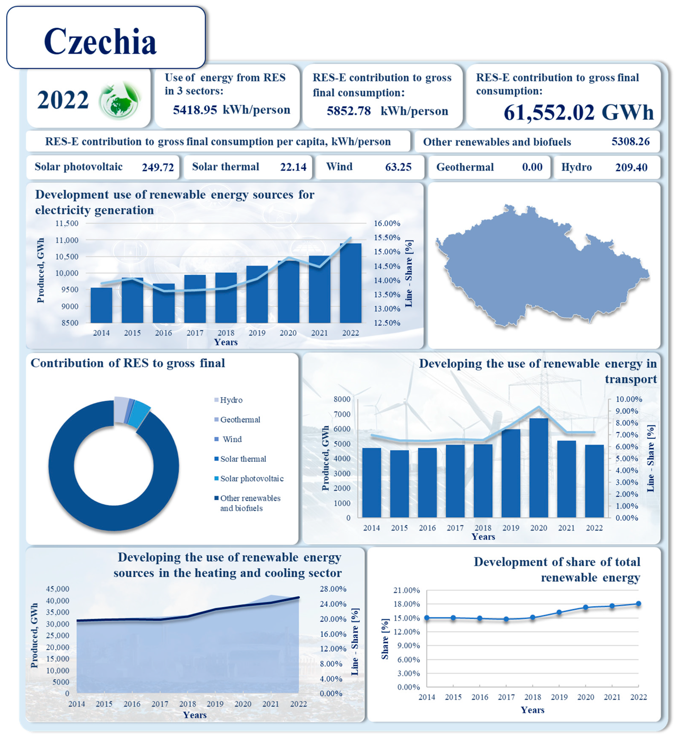 The share of RES in electricity generation reached 15.50% in 2022. Although this is an increase from 13.89% in 2014, the gradual pace is insufficient to meet the set targets. The situation is even worse in the transport sector, as the share of RES in 2022 reached only 7.20%, practically the same as in 2014 (7.00%). This points to the urgent need to implement measures to support second-generation biofuels and the electrification of transport. The total energy use from RES in the transport, electricity, and heating sectors in the Czech Republic is 5418.95 kWh/person.