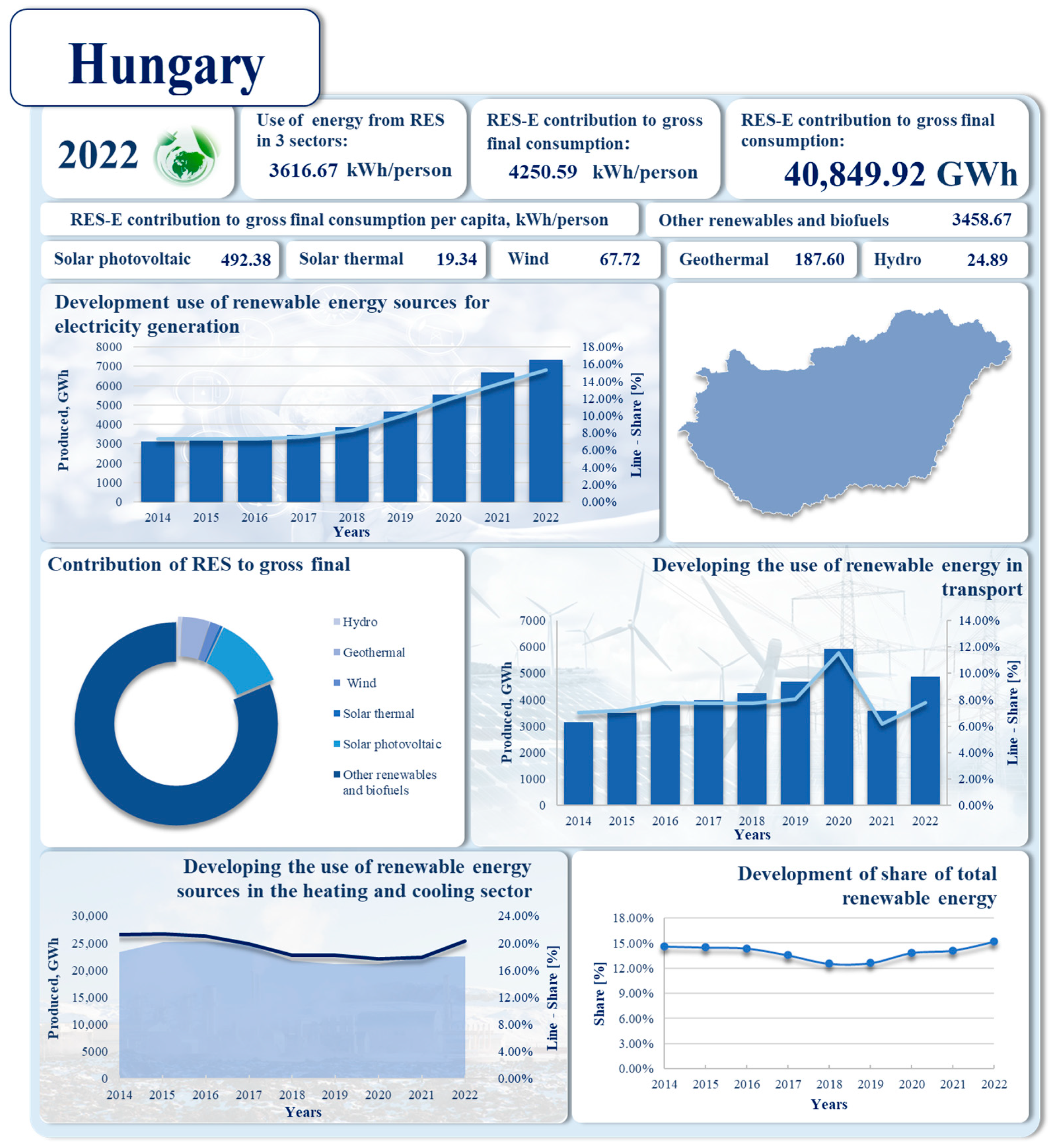 Hungary is striving to transform its energy sector towards increasing the share of renewable energy sources (RES) and reducing dependence on fossil fuels. Evaluating this development requires considering specific conditions and challenges. In 2022, the share of RES in gross final energy consumption reached 15.19%. Analysis of the structure of this share and the rate of growth is key to assessing the fulfilment of the targets set in the National Energy and Climate Plan (NECP) and in accordance with the recommendations of the International Energy Agency (IEA).