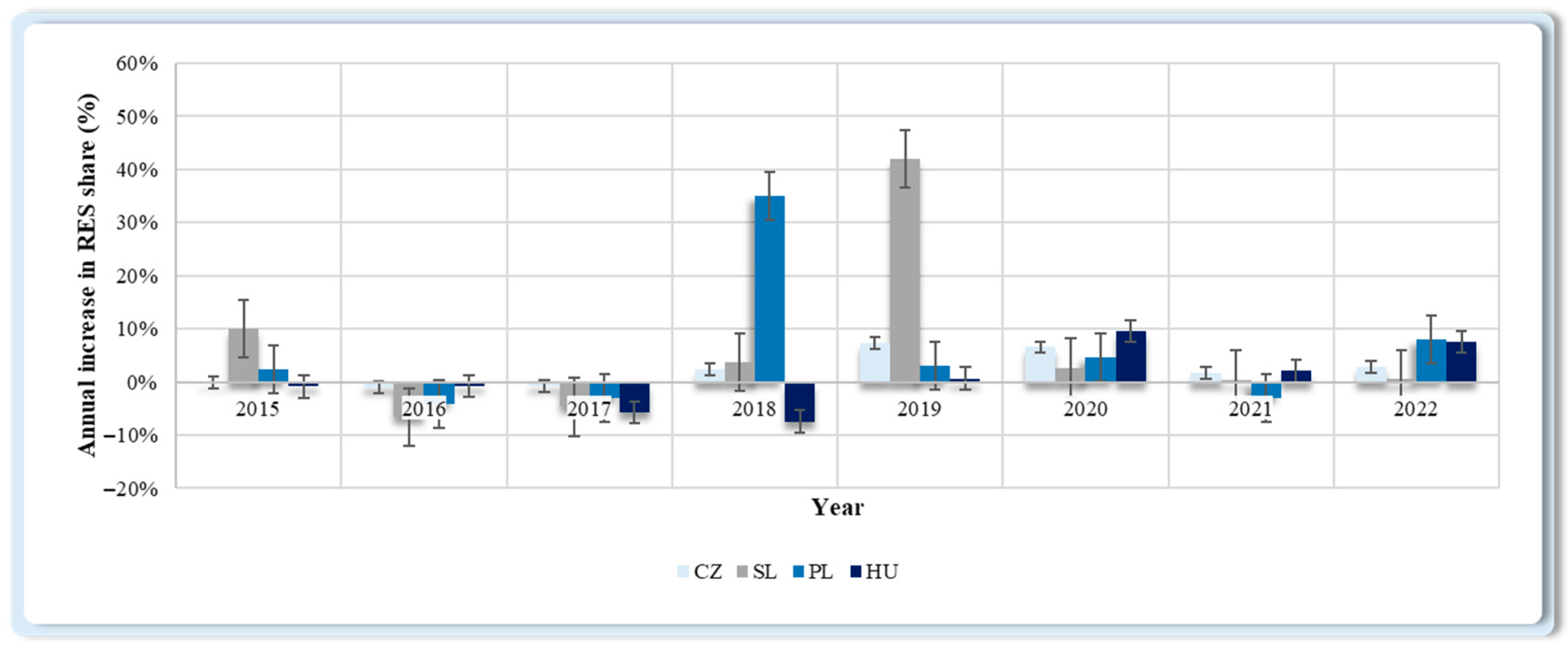 To better understand the dynamics of RES development in the V4 countries, we analysed the annual increase in each country’s RES share between 2015 and 2022. The results are shown in