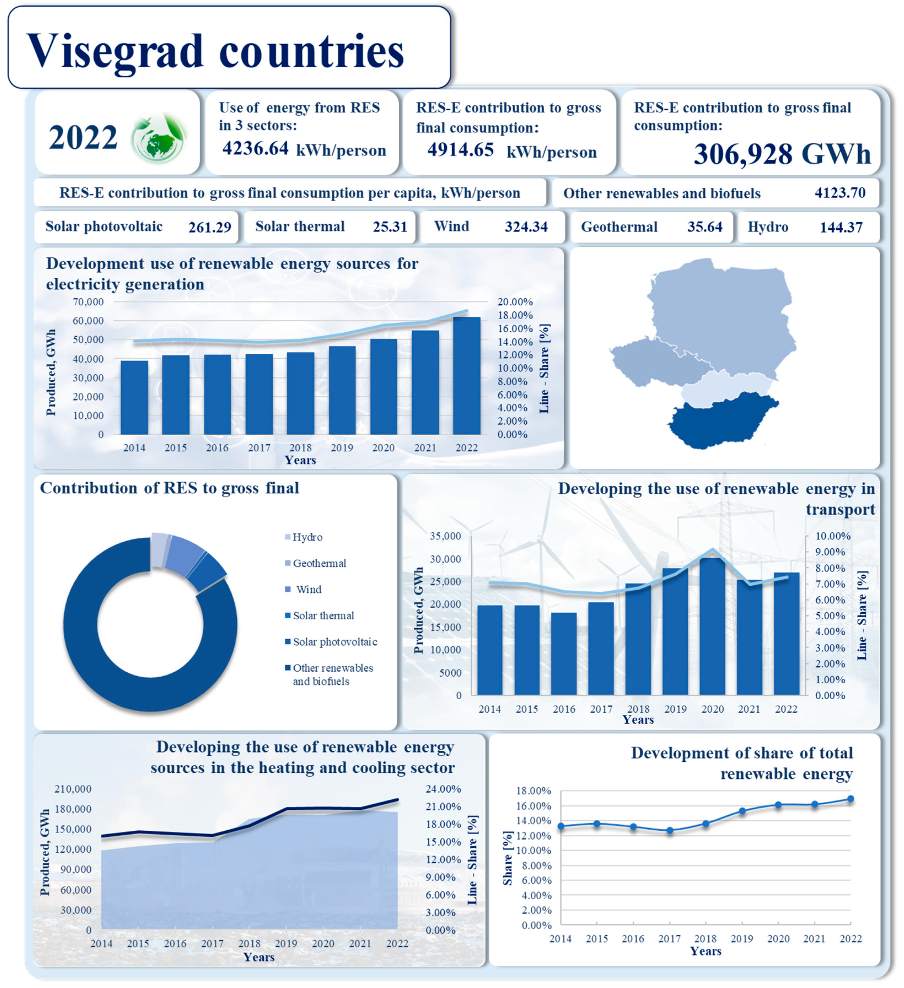 This study’s methodological basis was the analysis of the development of renewable energy sources (RES) in the Visegrad Four (V4) countries from 2014 to 2022 (