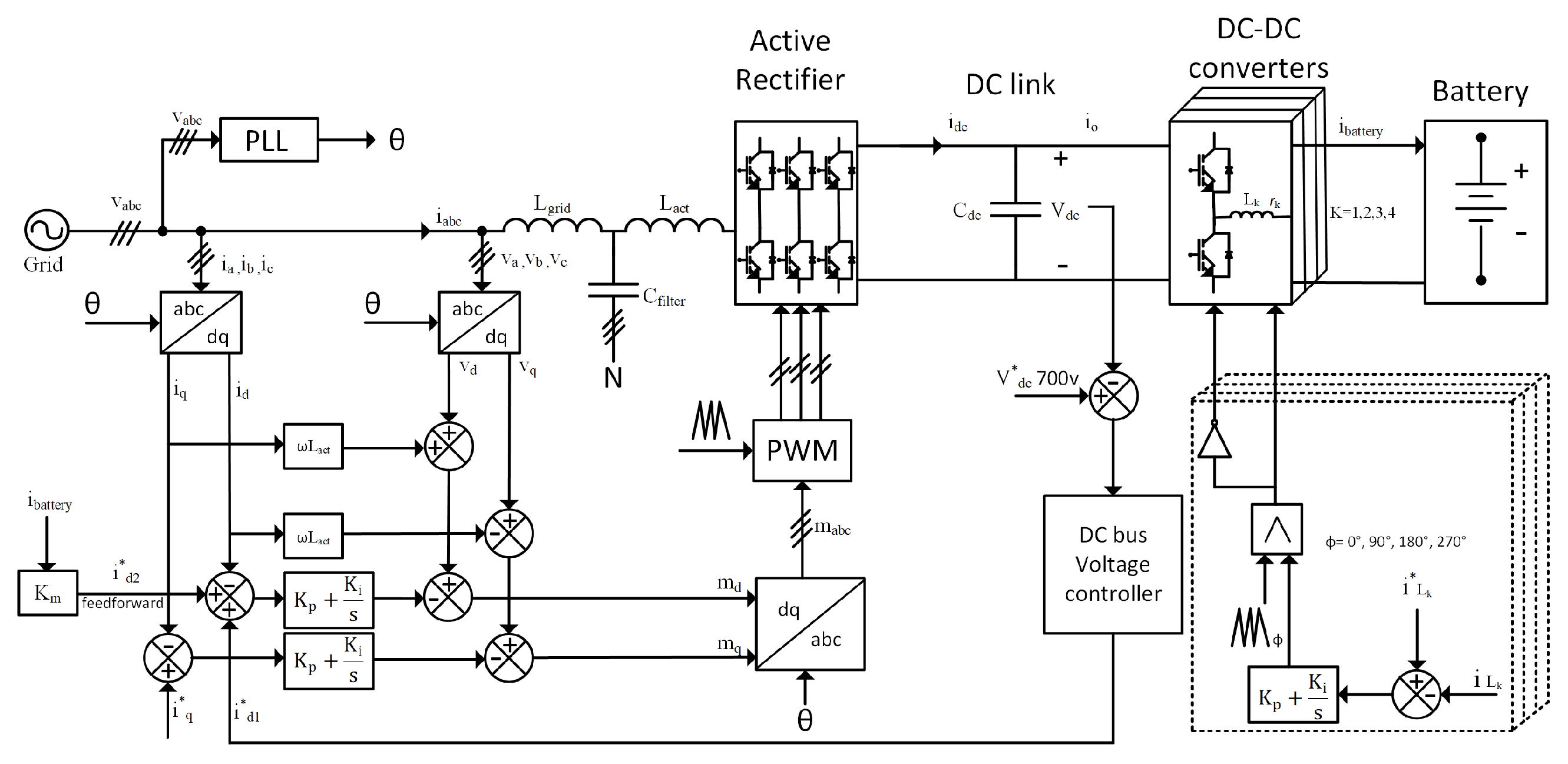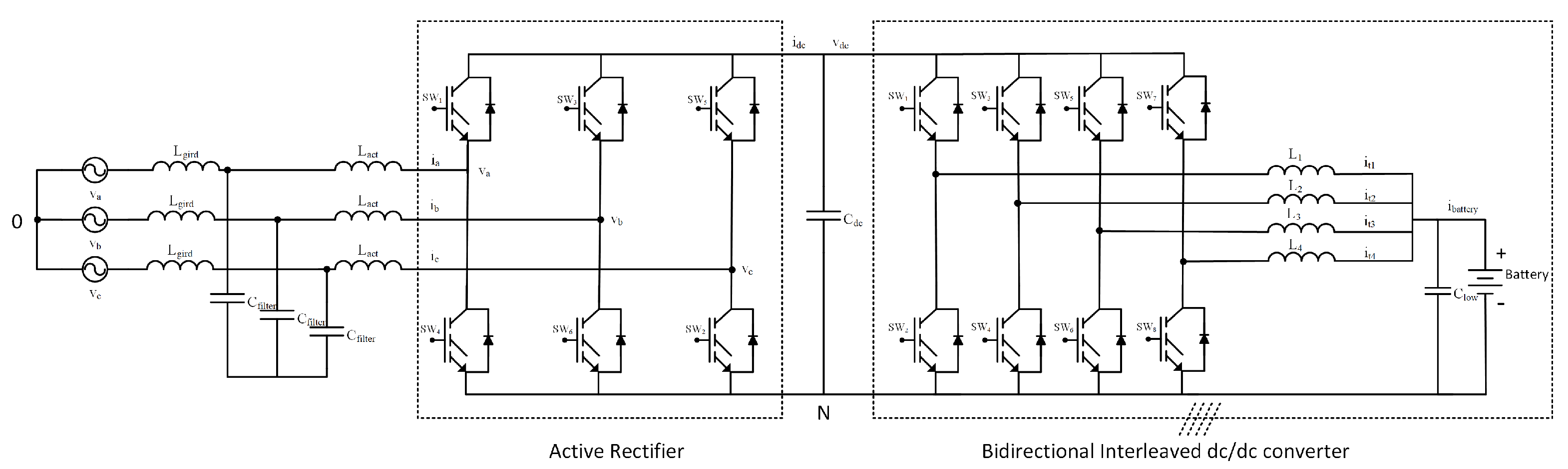 - A complete dynamic model of an integrated system comprising a three-phase AC/DC rectifier with an LCL filter and a four-phase interleaved bidirectional DC/DC converter is presented, explicitly capturing the coupling dynamics through the DC-link.