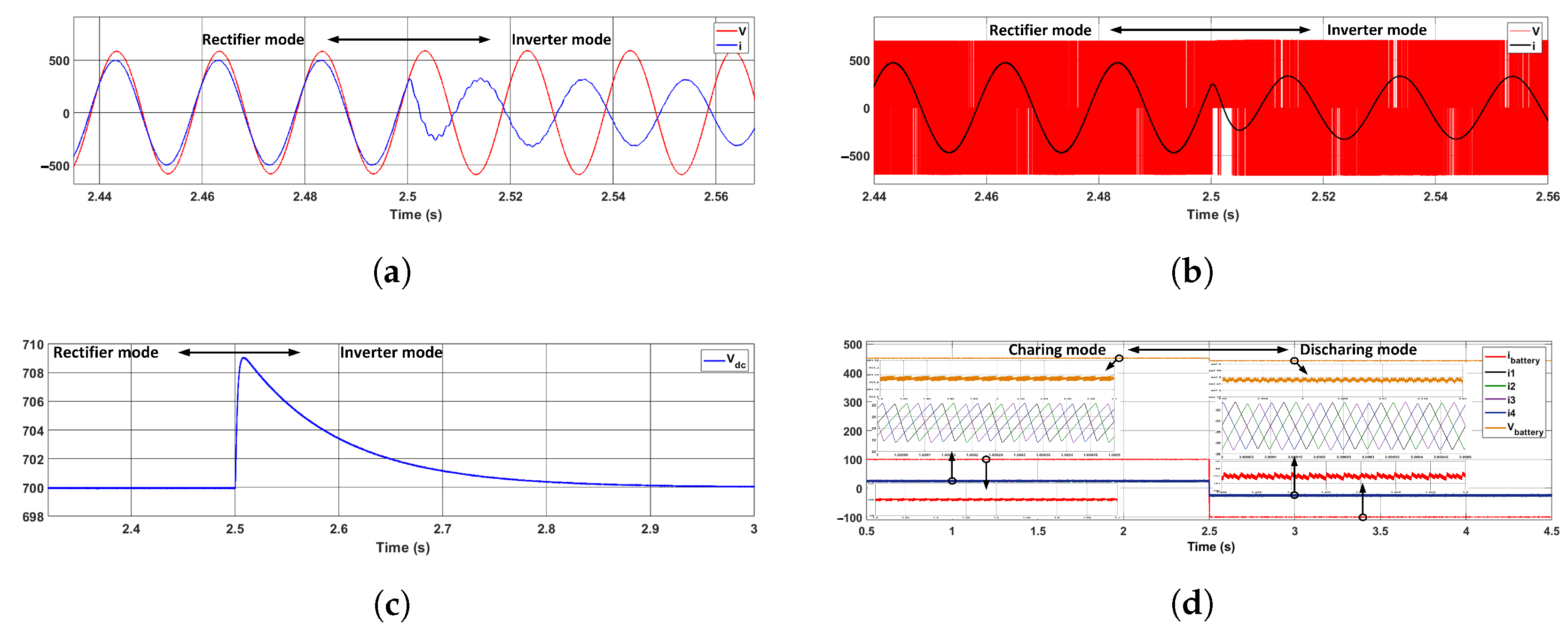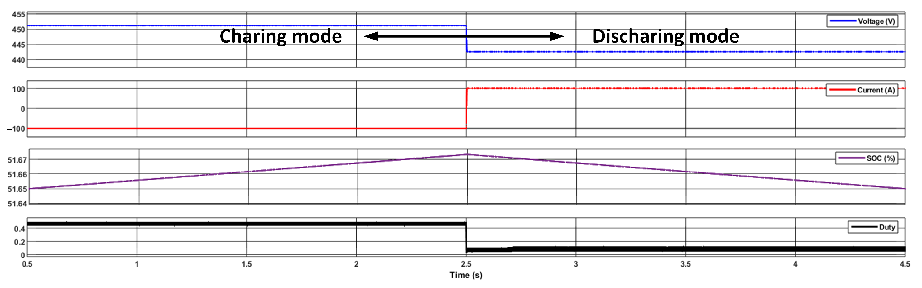 - Discharging: where the DC/DC stage operates in boost mode to elevate the battery voltage, and the AC/DC stage operates as an inverter to inject power back into the grid, all while maintaining DC-link voltage stability.