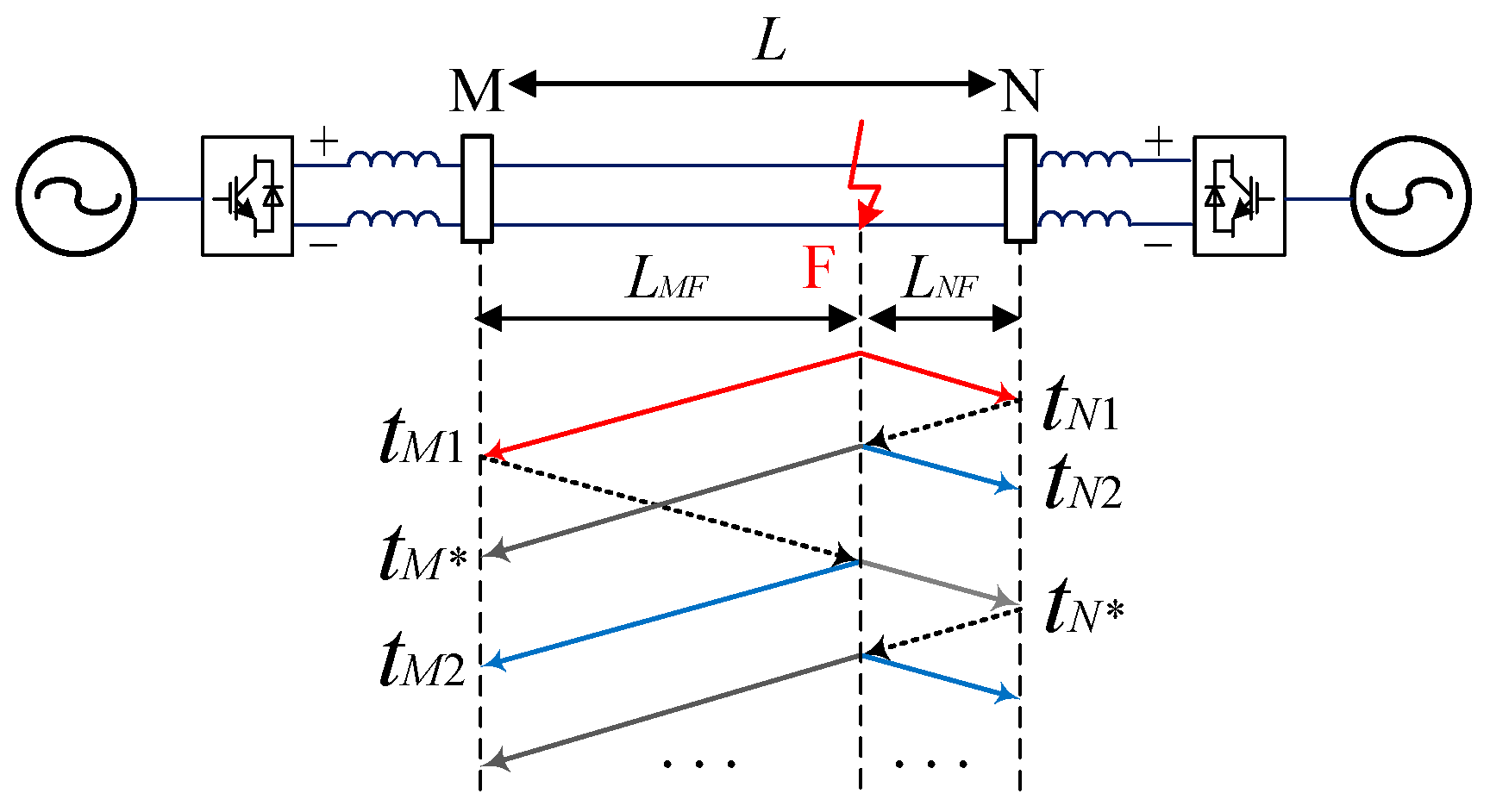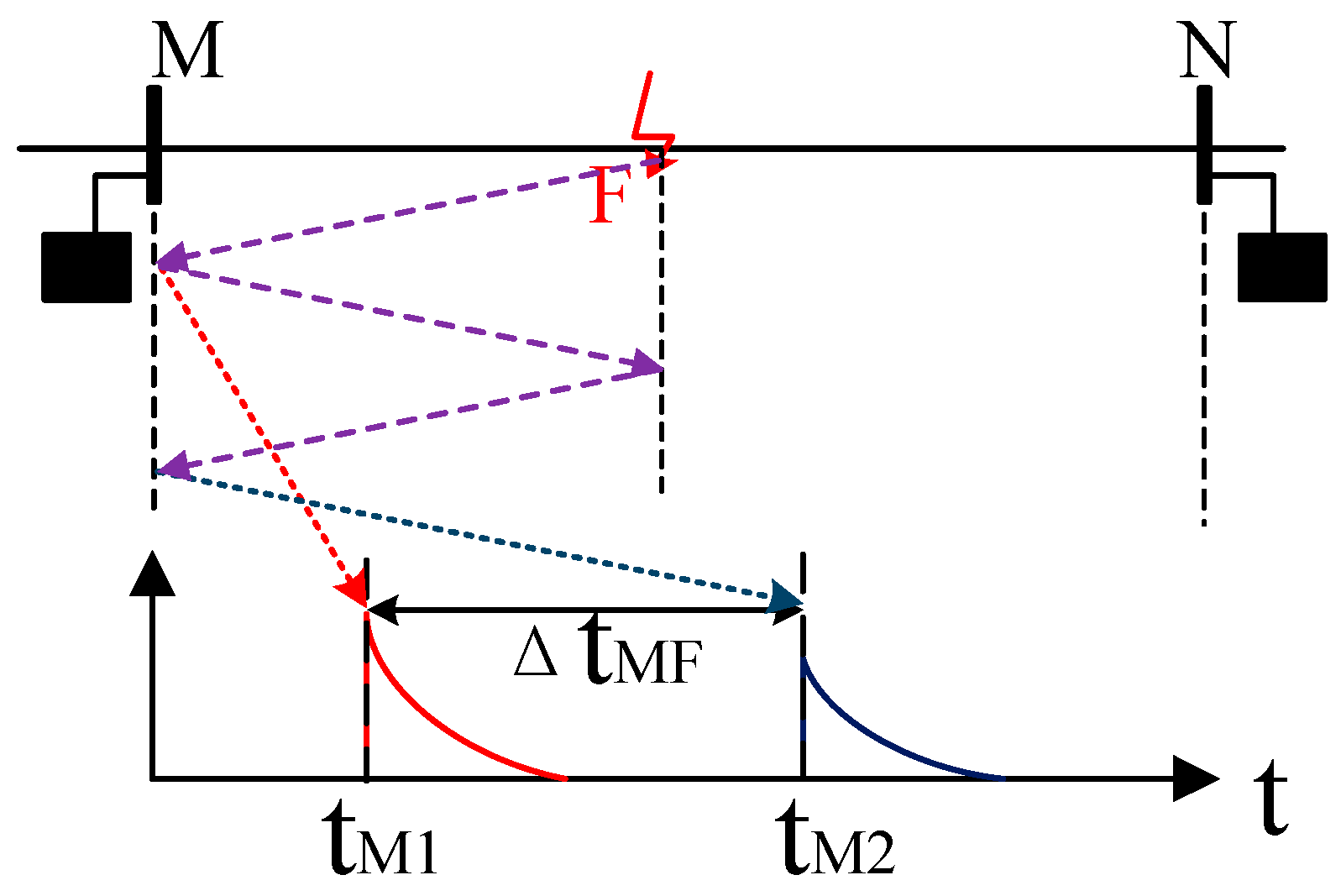 Fault-Point Reflected Wave (FPRW): This is the traveling wave that has reflected from the fault point itself. In the sequence of events for the M side, the IFTW from F to M is fully reflected at M (again due to the smoothing reactor). This reflected wave then travels back toward the fault point F, where it reflects (partially, since the fault presents a finite impedance) and returns to M. The wave that returns to M from the fault constitutes the fault-point reflected wave. We denote its arrival time at M as tM2 (this is the same quantity introduced in the single-ended method). Likewise, on the N side, a similar wave would arrive at time tM2. Together with any refracted components generated during propagation, these constitute the FPRW set—the set of wavefronts that have reflected off the fault point before reaching the measurement location.