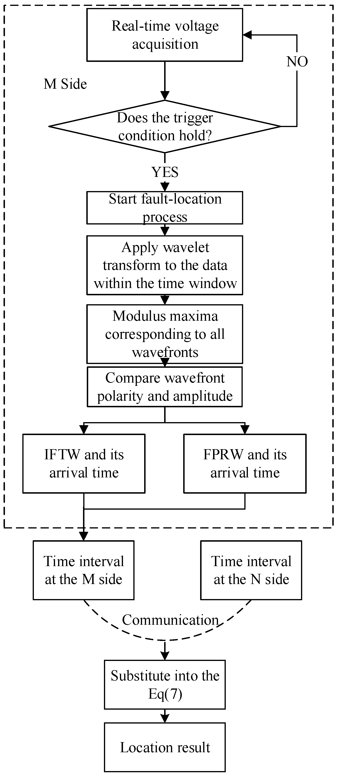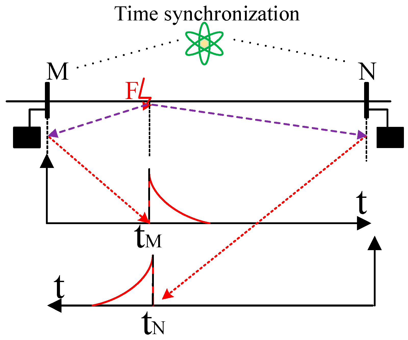 Fault Detection and Data Acquisition: When a fault is detected on the line, begin high-speed recording of transient voltages (or currents) at measurement points M and N. Use a sufficiently high sampling rate to capture the traveling wave fronts.