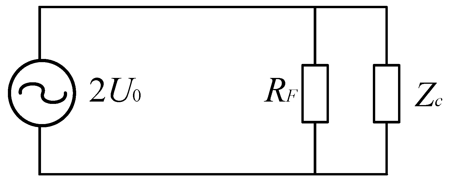 When a traveling wave encounters the fault point F, a portion of its energy is transmitted (refracted) past the fault, and the remainder is reflected. To characterize this, let the transition resistance at the fault point be RF, and let ZC be the surge impedance (characteristic impedance) of the line. According to Pedersen’s formula for wave splitting at an impedance discontinuity, the fault can be modeled as an equivalent impedance R (combining RF in parallel with the line behind the fault point) seen by the incoming wave.