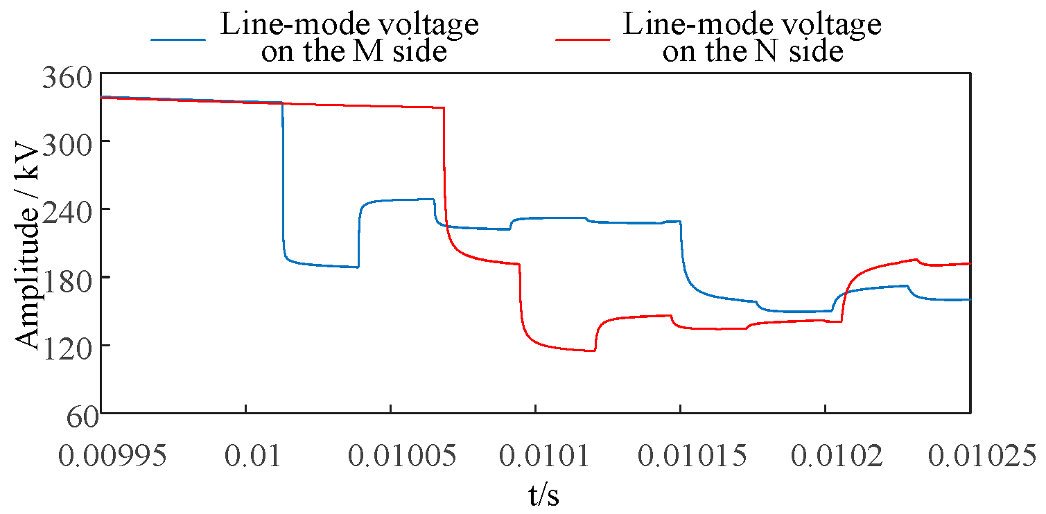 A positive-side ground fault was simulated via a 20 Ω transition resistor. The fault duration was 0.1 s, occurring 2.4 km from the M-side. The M-side voltage was transformed into a line-to-ground voltage using a line-to-ground transformation with respect to the N-side bipolar voltage, yielding the waveform shown below