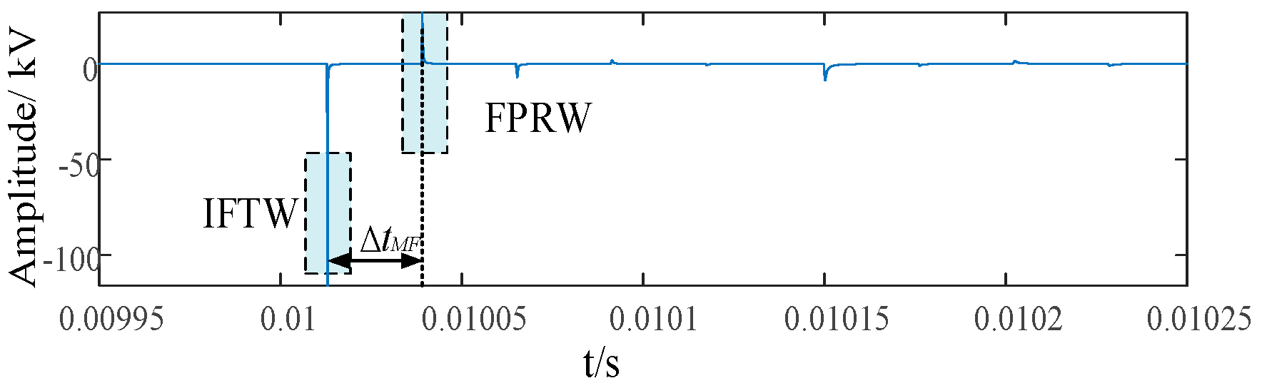 Figure 8, the time corresponding to the wavelet transform mode maximum represents the arrival time of the traveling wave. The first mode maximum corresponds to the IFTW. The arrival time of the IFTW on the M side is:
