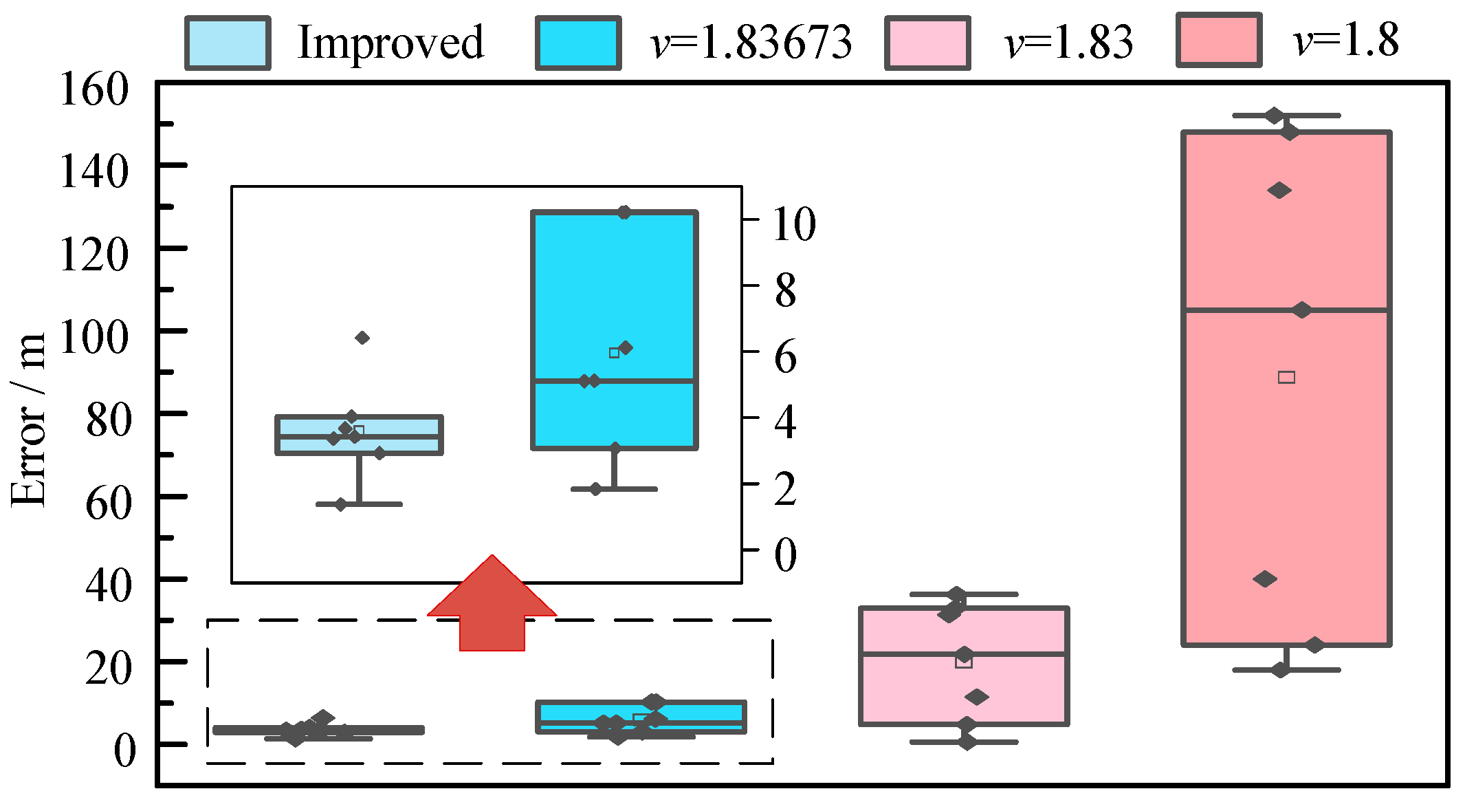 8 m/s (accurate to four decimal places), its error remains greater than that of the improved method. Simulation results demonstrate that the proposed improved algorithm’s calculations are independent of wave velocity and significantly reduce ranging errors caused by wave velocity inaccuracies.