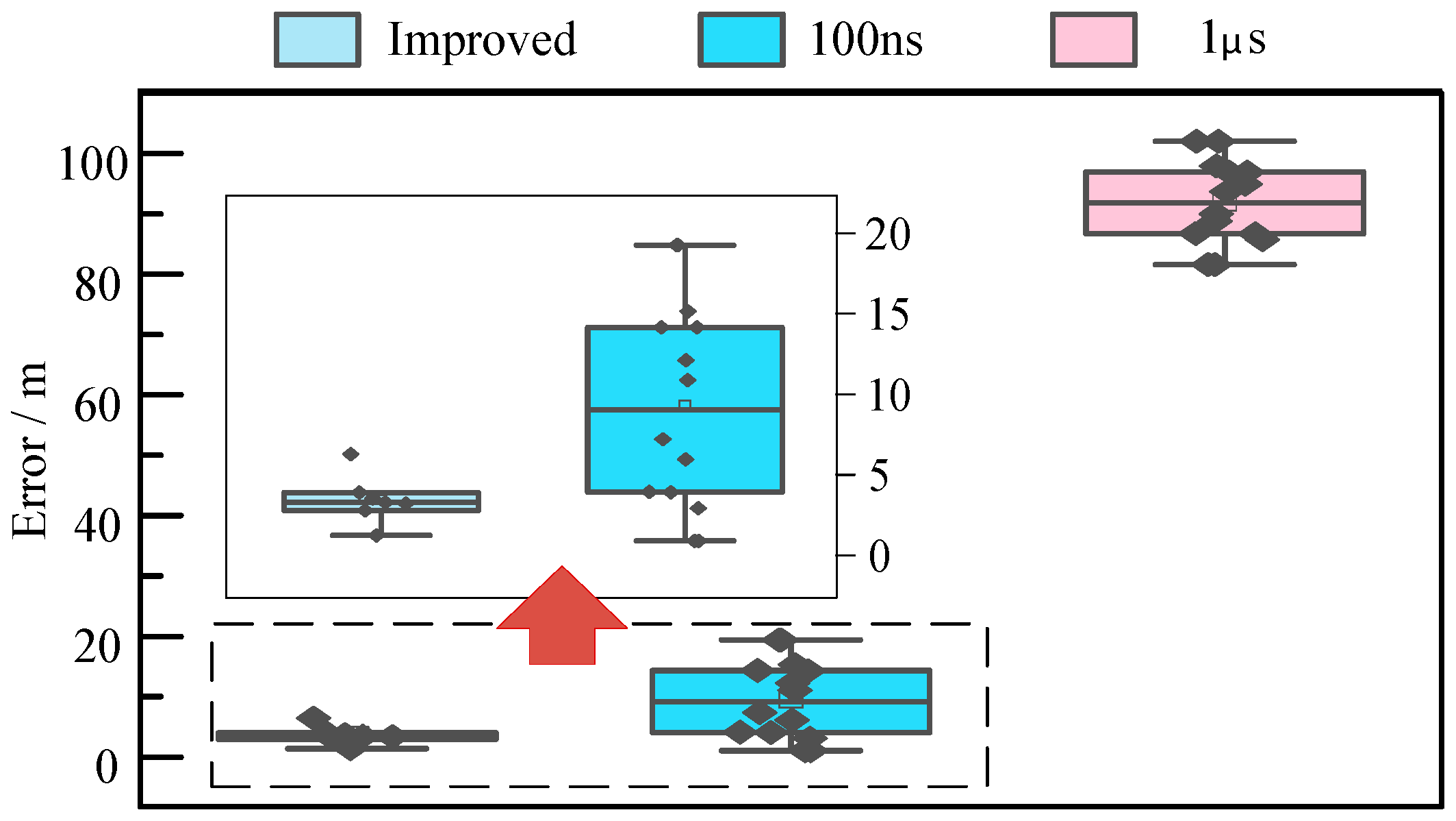 The traditional two-point ranging method relies on precise synchronization between clocks at both ends, whereas the improved algorithm fundamentally does not require clock synchronization. Currently, synchronization devices used in field applications exhibit timing errors ranging from 100 ns to 1 μs. The performance of both algorithms is compared under conditions where timing errors exist.