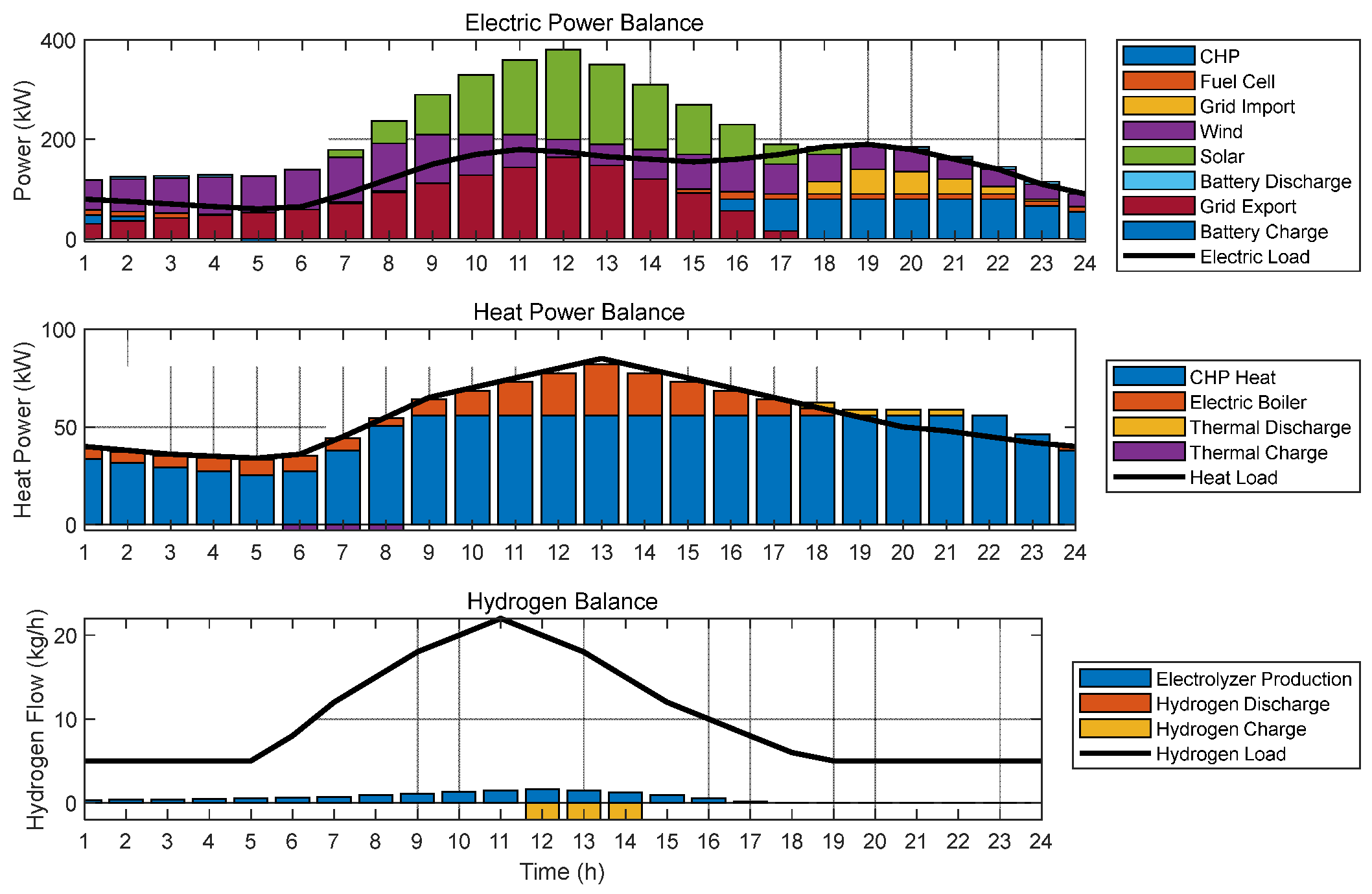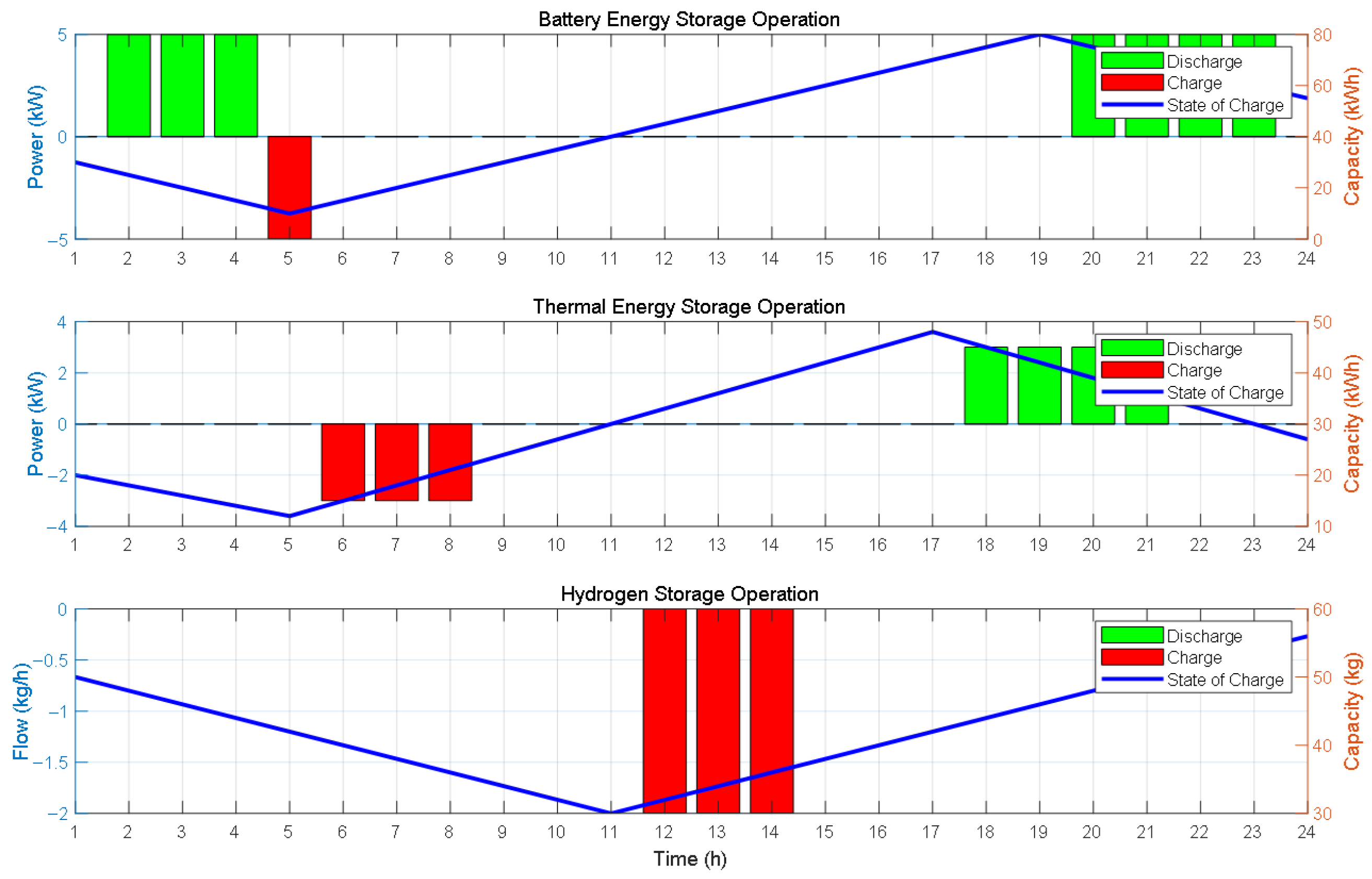 The optimization variable x encompasses the power output of specific equipment. The optimization variable y reflects the operational status (on/off) of fuel-based units. Equality constraints are established based on energy balance principles within the system and the energy dynamics of storage devices. Inequality constraints define the operational limits of individual components. To enhance computational speed and efficiency, this study adopts a methodology similar to that proposed in the relevant literature, transforming the problem into a Mixed-Integer Linear Programming (MILP) formulation and solving it using the CPLEX solver.