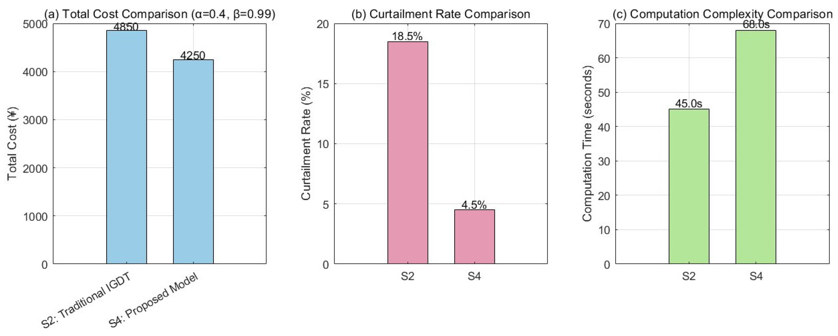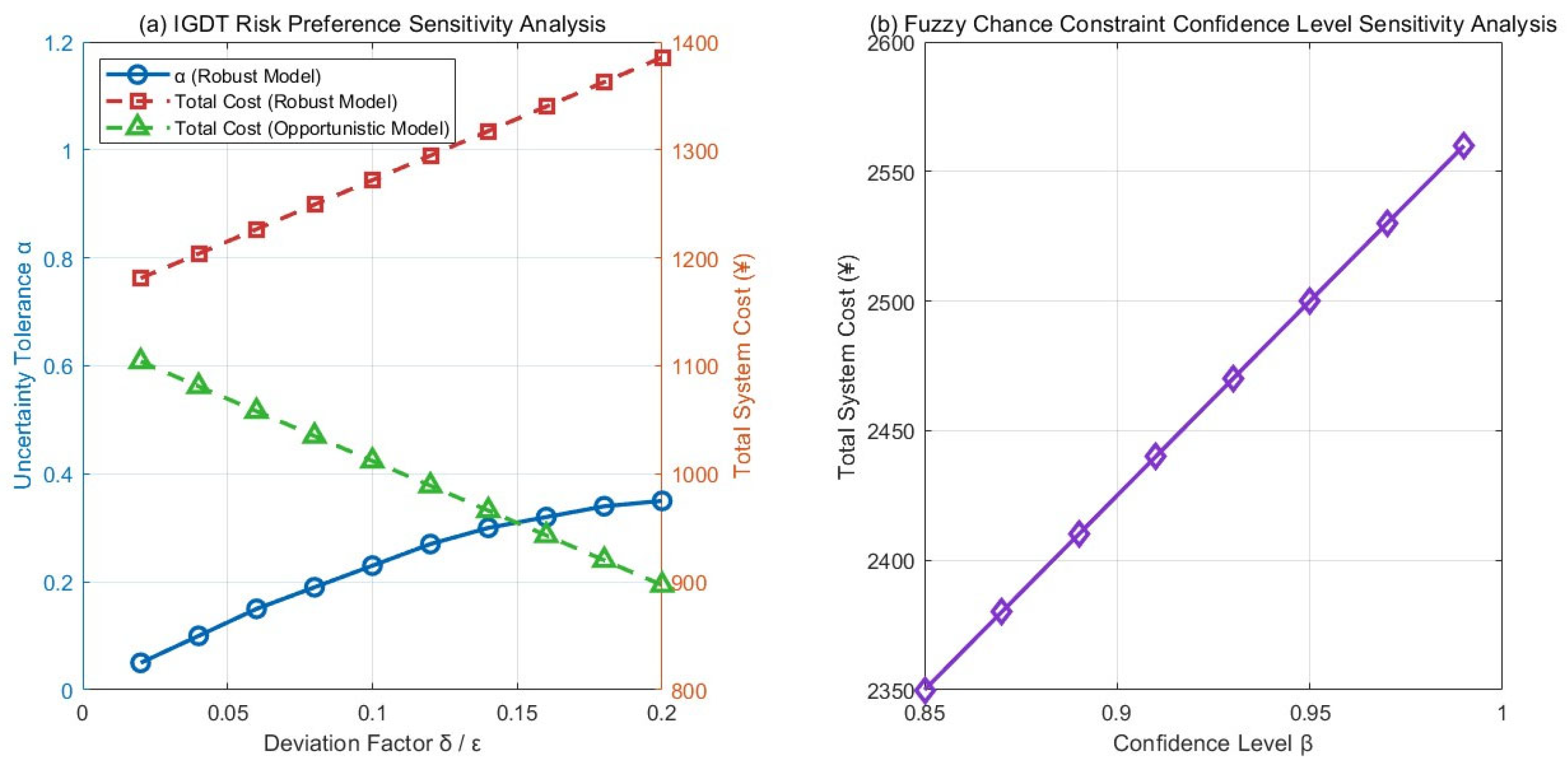A dual-layer uncertainty handling framework combining IGDT and fuzzy chance constraints was proposed. IGDT was used to handle interval uncertainties in renewable energy output, characterizing decision-makers’ risk preferences; fuzzy chance constraints were employed to address load uncertainties, transformed into deterministic equivalent forms for solution.