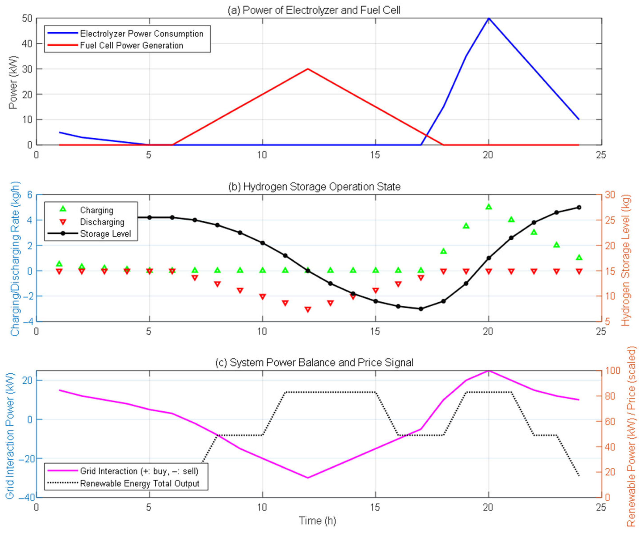 The above constraints pertain to hydrogen energy storage, which typically does not consider efficiency differences or mutual exclusion between charging and discharging processes, with its state represented by volume. Where and denote the hydrogen charging and discharging rates of the hydrogen storage tank, respectively; represents the capacity of the hydrogen storage tank at time period t.
