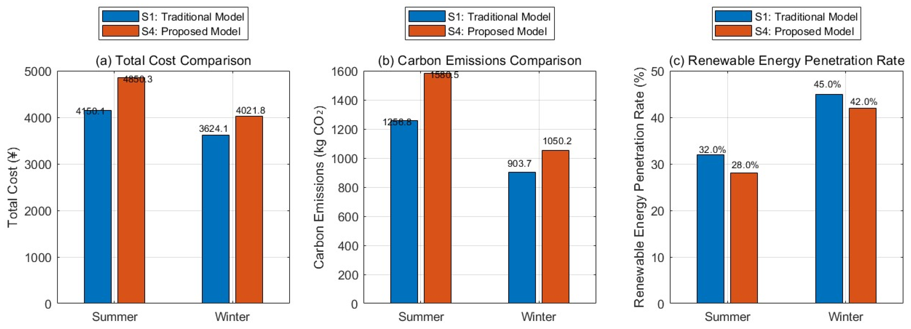 (2) Multi-dimensional comparative experiments across different seasons, risk preferences, and carbon policies validate the universal applicability and superiority of the proposed model. Particularly under winter conditions with high heating demand and extreme uncertainty scenarios, the model demonstrates enhanced robustness and flexibility, with relative performance improvements even exceeding those observed in summer, providing an effective solution to thermal-electric conflicts.