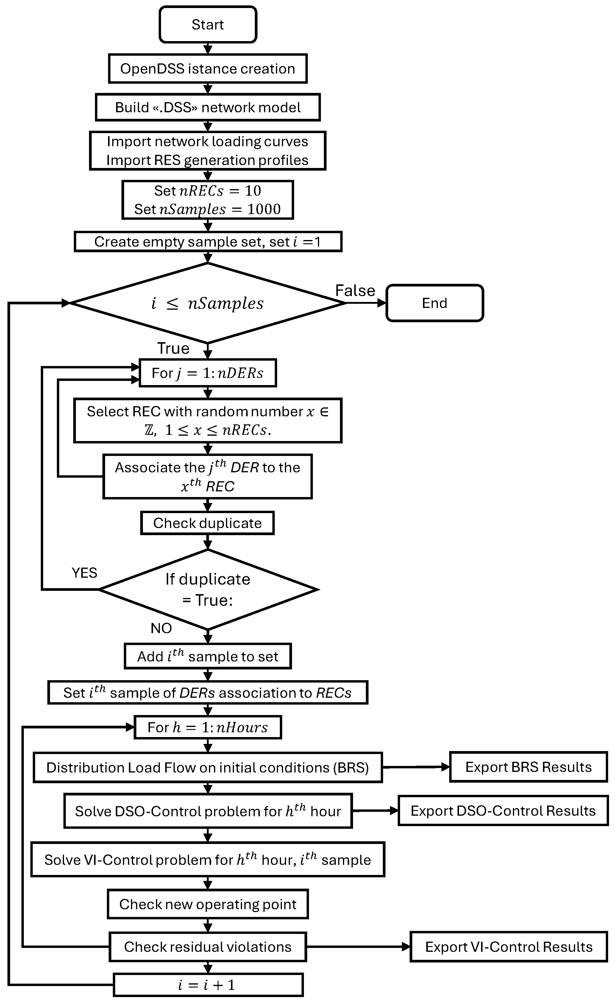 Afterwards, the number of RECs and Monte Carlo samples to be generated is set. Thus, the Monte Carlo algorithm is performed, associating, for the sample, each DER with the REC. A set of generated samples is created to control possible duplicates and avoid samples with the same association of DERs with RECs. Once the sample is added to the set and the association of DERs with RECs is carried out, the solving algorithm is executed. For each hour of the simulation period, an initial load flow analysis is performed to collect violations for the BRS. Thereafter, the VI-Control optimization problem is executed, collecting the residual violations not mitigated. Please note that, in the case of DSO-Control, the resolution algorithm does not comprise the Monte Carlo algorithm, as it is based on the use of all flexible resources, not considering the REC association.