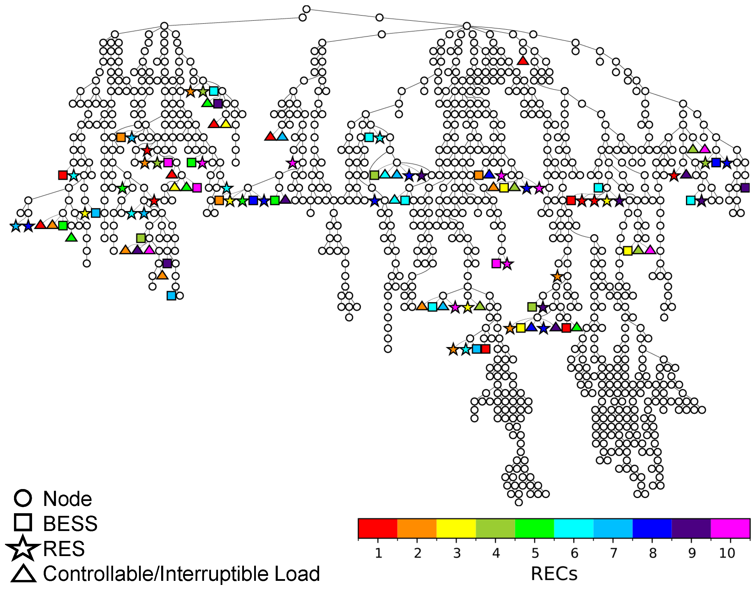 Figure 3 shows the topology of the DN, with one of the random samples generated, the flexible resources added to the DN are indicated with different shapes (square, star, and triangle) based on the relative technology, while the association with 10 RECs is shown illustratively using different colors.