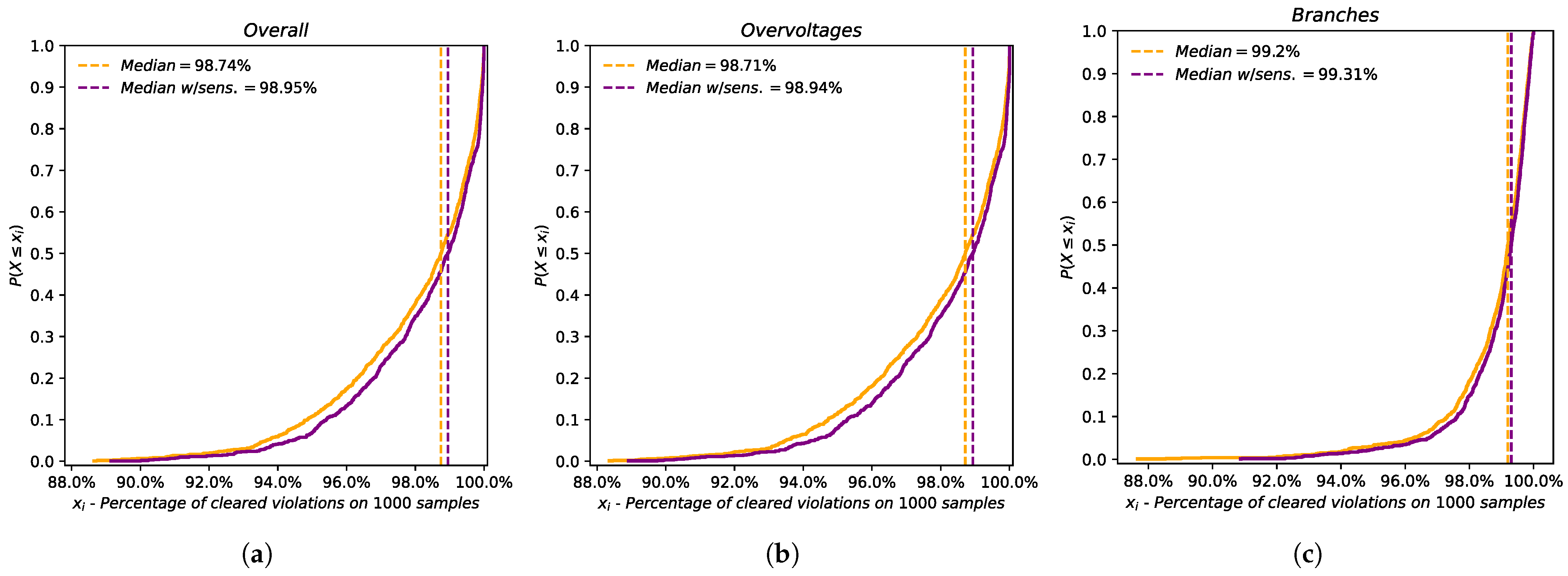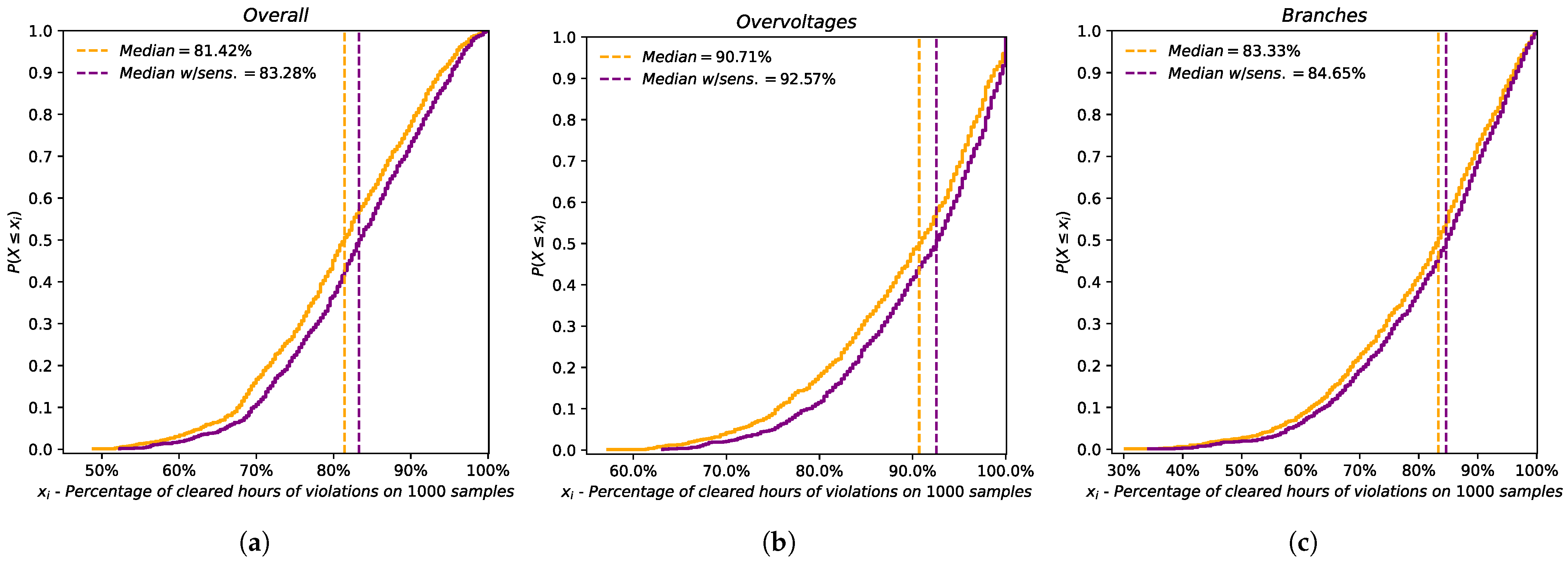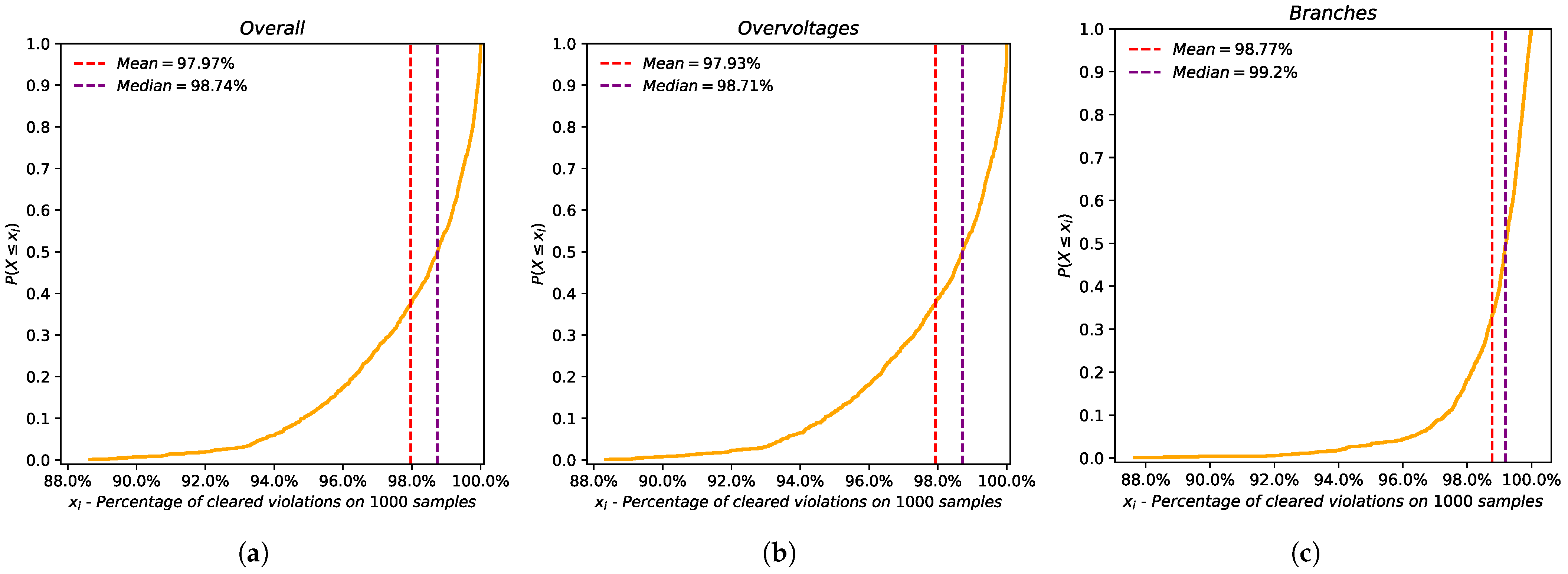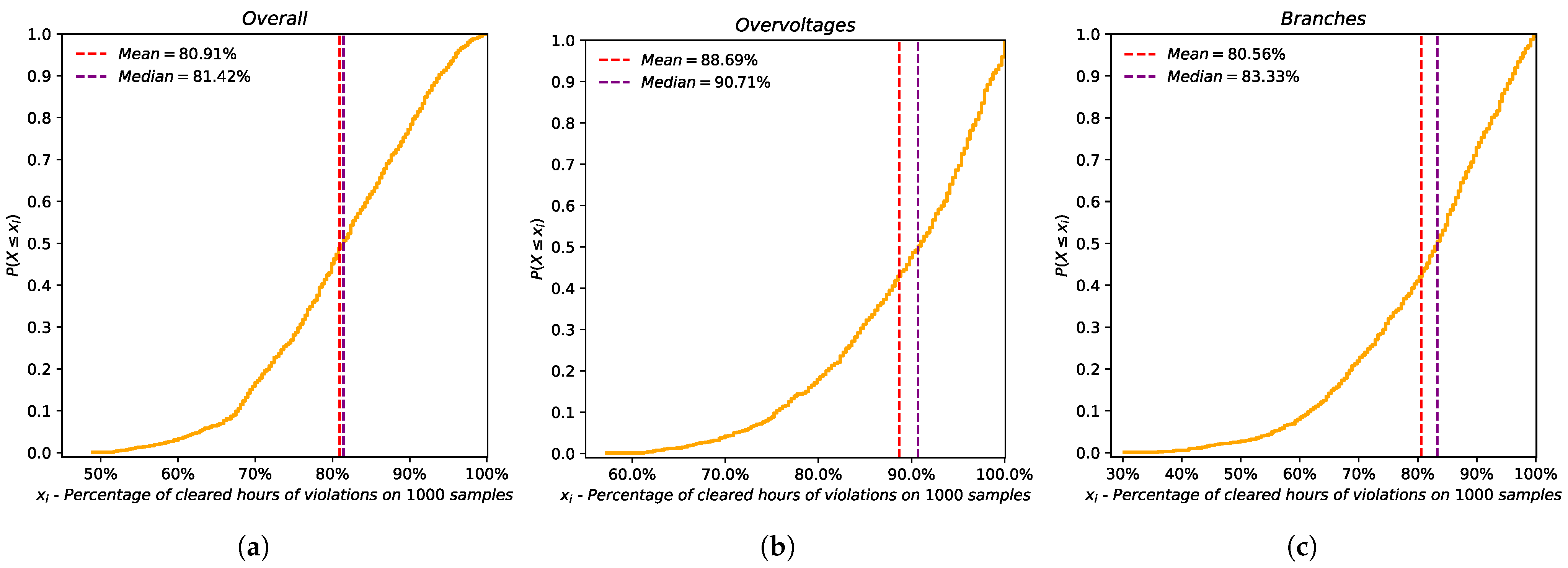 Other results can be seen in the percentage of the number of mitigated violations, where the mean and median values are more than 98%, with different samples reaching 100% of mitigated voltage and branch violations. The worst-case scenario results in a percentage mitigation of approximately 88%, proving that samples in which more hours with critical operating conditions persist are actually characterized by a low number of unsolved violations. As shown in the cumulative distribution curve in