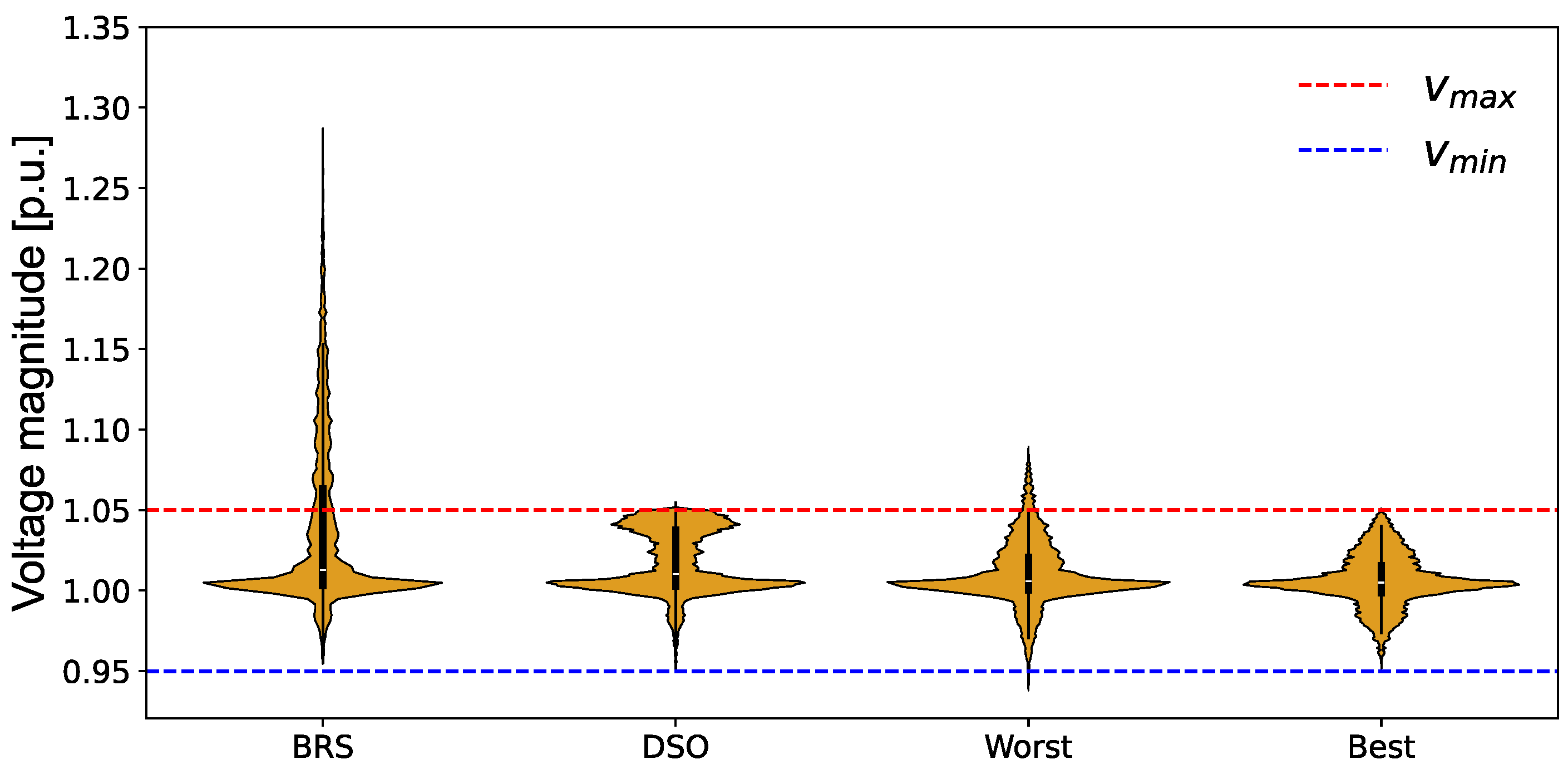 The total violation of voltages was solved in the best-case sample. Although the worst-case sample leads to few unsolved voltage violations, the under-/over-voltage values reached at the end of VI-Control are significantly lower compared to the BRS. In addition, the maximum and minimum values reached in the worst case (