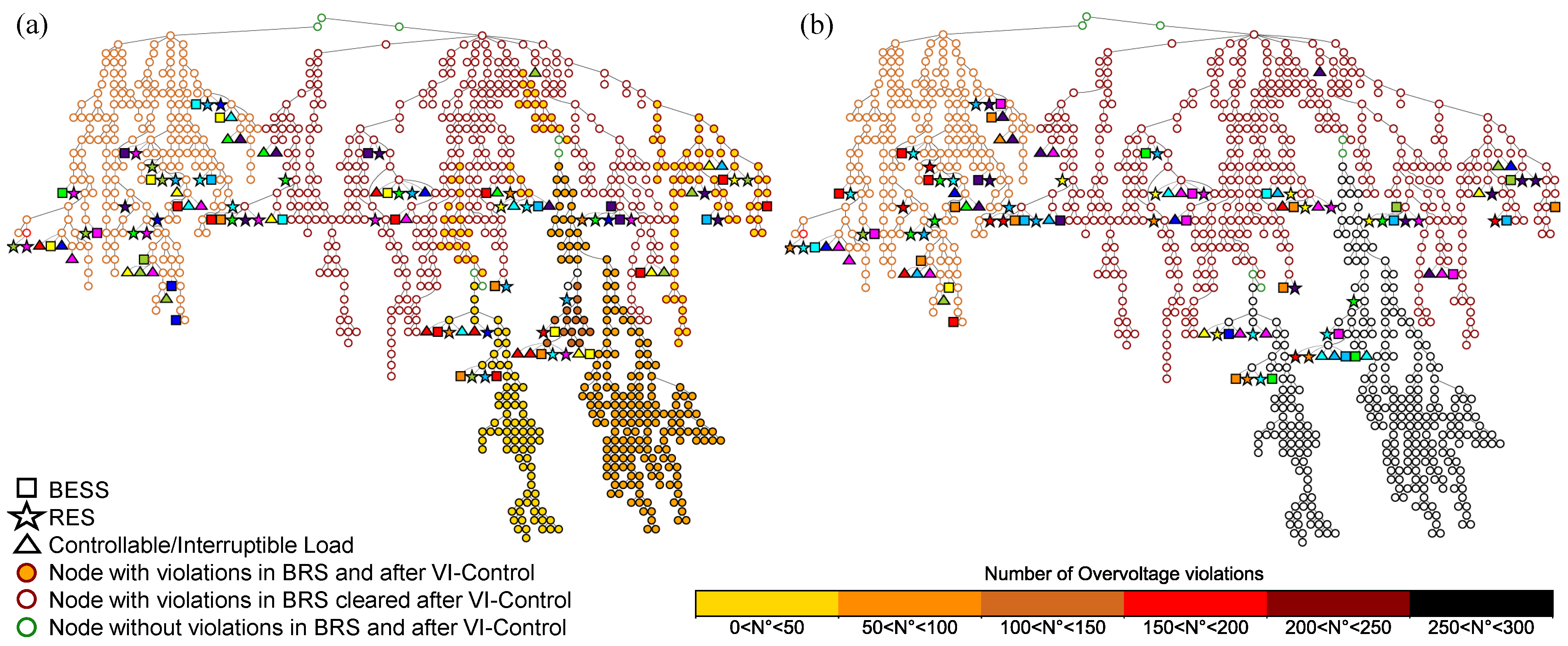 Figure 7a), the distribution of DERs belonging to the same REC is more scattered around the DN. Despite this, once VI-Control is performed, the majority of violations are cleared in several nodes, as previously discussed (more than 88%). Considering unsolved violations, few of them are experienced in nodes where connected DERs belong to the same REC and are close to each other (gold dots). However, more unmitigated violations persist in nodes where the nearby connected resources belong to different RECs, leading to a limited effect achieved by the VI condition (darkorange dots). This is also due to the fact that in some RECs, the total RES generation is often comparable to the total demand during the simulation period; thus, there is no need to significantly increase the demand of the relative BESS/DR to match the RES output. The VI-Control performed with the best sample (