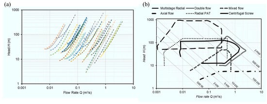 (a) Characteristic Q-H curve predictions for the 42 Screw-PAT models; (b) Operating region in comparison with other PATs. Each colored line refers to a single pump model used in the analysis.