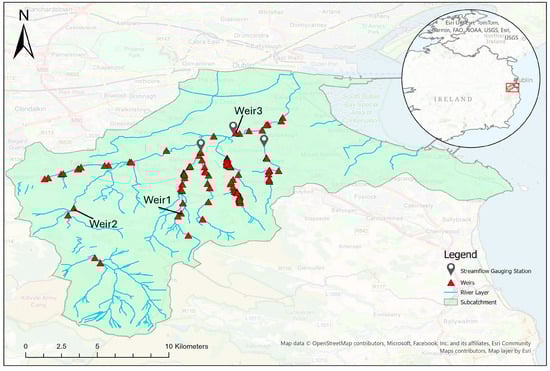 Historical streamflow data for the 10-year duration ending on 31 December 2022 for sites with gauging stations were obtained from either the Environmental Protection Agency or Office of the Public Works (in Ireland). Using the area–discharge method the daily streamflow was deduced from stream gauge locations to the individual weir sites [,]. Figure 4 shows the location of the investigated weirs and streamflow gauging sites for the Dodder sub-catchment area. This contained most of the investigated sites outlined in Table 1. The resultant available power time series data for each weir site is provided as Supplementary Material S1.
