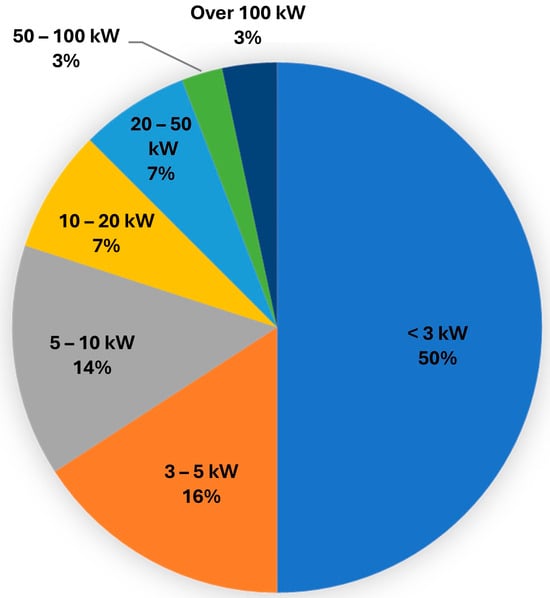 In Figure 5 the breakdown of the hydropower potential by output power at the investigated weir sites is shown, assuming mean flow conditions. It is apparent that about half the existing weirs investigated are not suitable for hydropower generation as part of the BMS due to their lower height and streamflow combination resulting in potential power output of less than 3 kW.
