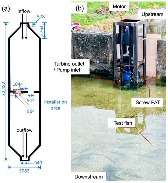 Field testing was conducted at the Inland Fisheries Ireland (IFI) fish farm in Roscrea, Ireland in a concrete rearing pond shown in Figure 6a. Water enters the pond at one end (upstream) and flows through the pond, exiting at the other end (downstream). The internal dimensions of the pond measured 32.4 m in length, 4.6 m in width, with a maximum dept of 1 m. There was a dividing concrete wall in the centre of the pond at 16 m, separating the upstream and downstream parts of the pond. Within the dividing wall there were two 0.9 m wide openings. One of the openings was blocked and the Screw-PAT was installed in the other. This allowed the levels of the upstream and downstream sides to be managed during the tests.