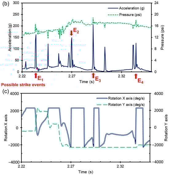 Results of the deployment of the ARC 800 sensor fish in pump mode, showing (a) ARC 800 fish sensor; (b) acceleration, pressure, and possible strike events—possible strike event E1 approximately occurs at the PAT inlet, E2 and E3 inside the screw impeller, while E4 at the 90 degrees pipe bend towards the outlet; and (c) rotation in degrees per second along the X and Y axis.
