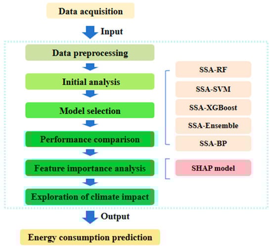Figure 1 is the flowchart of the research. It outlined a structured methodology for energy consumption prediction, integrating data-driven modeling and climate impact analysis. The process began with data acquisition and preprocessing to ensure input data quality. Subsequently, multiple optimized prediction models—including SSA-RF, SSA-SVM, SSA-XGBoost, and SSA-BP—were constructed and compared through model selection and performance comparison. An SSA-Ensemble model might also be developed to enhance robustness. The optimal model was then interpreted using the SHAP model for feature importance analysis, facilitating the exploration of climate impact. The final output is an accurate and interpretable energy consumption prediction, providing valuable insights for energy planning and policy-making.