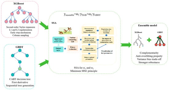 The ensemble model had the advantage of two complementary algorithms. XGBoost had the strong ability to capture complex nonlinear relationships, while GBDT was more robust to noisy data. The difference between the two algorithms provided model diversity and reduced the deviation of a single model. A single model might have variance or bias. Ensemble models could achieve better variance–bias trade-offs. Therefore, by optimizing the weights, the model found the optimal balance point. XGBoost and GBDT might capture different feature interaction patterns, so the ensemble model could comprehensively utilize different interaction information. The combination model was automatically searched for the best weight combination based on SSA, avoiding the subjectivity of manually setting weights.