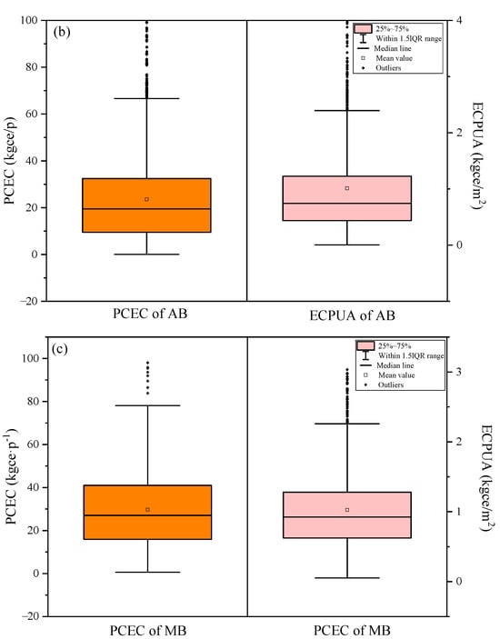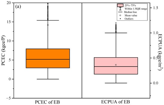 Per capita energy consumption (PCEC: orange) and energy consumption per unit area (ECPUA: pink) of various types of buildings: (a) Educational buildings (EB); (b) Administrative buildings (AB); (c) Medical buildings (MB). IQR is interquartile range.